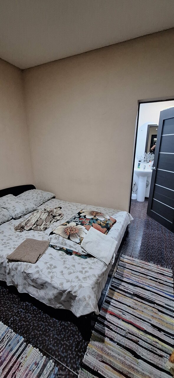 Странный номер. Единственное окно рядом с дверью. Шумоизоляция отсутствует. Пол ночи слушали музыку из машины местных. Сама комната напоминает узкую келью. Две кровати и стул. Всё. Есть ванная комната. И это порадовало. Были полотенца и шампунь одноразовый. Но, судя по упаковками на раковине, уборка после предыдущего гостя не производилась.