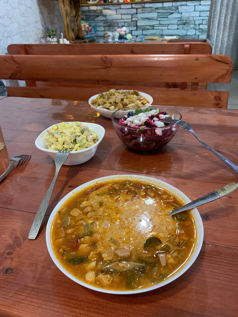 Остановились переночевать. Номер уютный. Не дорого. При отеле есть кафе. Порции ОЧЕНЬ огромные и вкусно. Я покушать люблю. Заказал харчо и пюре с отбивной и не смог осилить) ценник очень удивил, т.к очень дёшево.