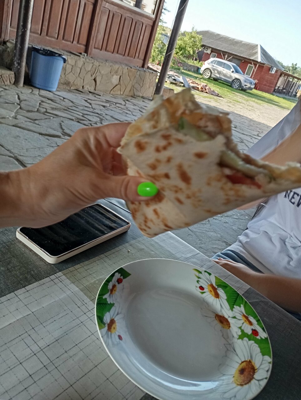 И да сочтут меня мерзавцем профессионалы мотельного отдыха! Все едут к морю. Клиентов-как комаров в Карелии. Ну какого же, скажите, пса, не сделать нормальный остановочный пункт в таком козырном месте? Цена хорошая. Тётя-администратор вдруг, по совместительству, повар и вообще бармен. И после того, как отсчитывает наличность, накладывает прям без паузы котлеты. Дай ей Господь здоровья! И ей надо, и нам, горемыкам транзитным, очень. Ну нет тут шумоизоляции. Нету. Надо принять. или пилить дальше. Переночевать можно. И мы, да, пробовали еду. Была конкуренция с мухами, у них аппетит был серьезнее. Машинка твоя, средство твоей доставки к соленой воде, рядом с тобой. Это славно. В комнатке категорически не хватает абсолютно дешевых вещей- крючков и полок. Как де воззвать к владельцам? Сограждане! Купите недорого пластиковых удобств! И счастье придет