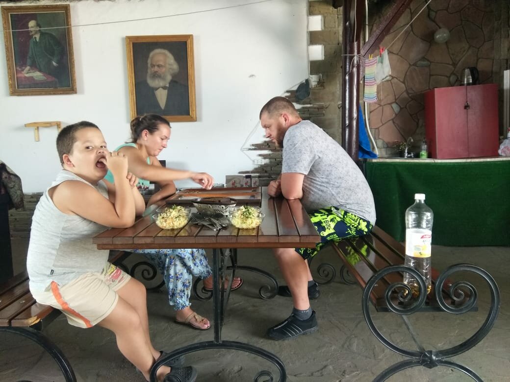 Небольшая комната, деревянная кровать,чисто, пахнет хорошо. Удобно, что машина стоит под дверью. Сейчас прохладно, но в принципе есть кондей. С утра удобно выпустить детей во двор, а взрослым спокойно сложить вещи.