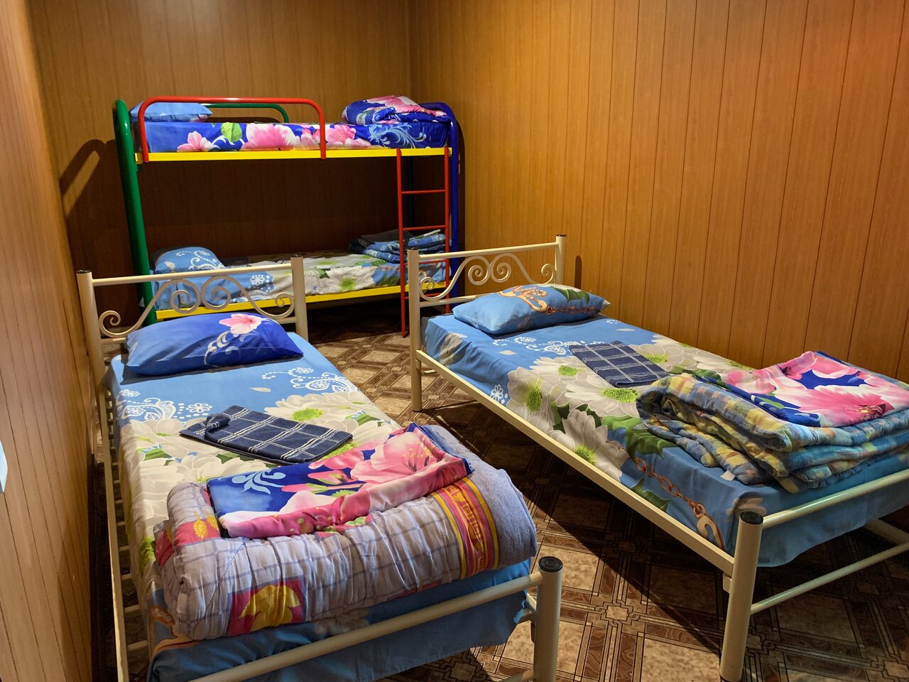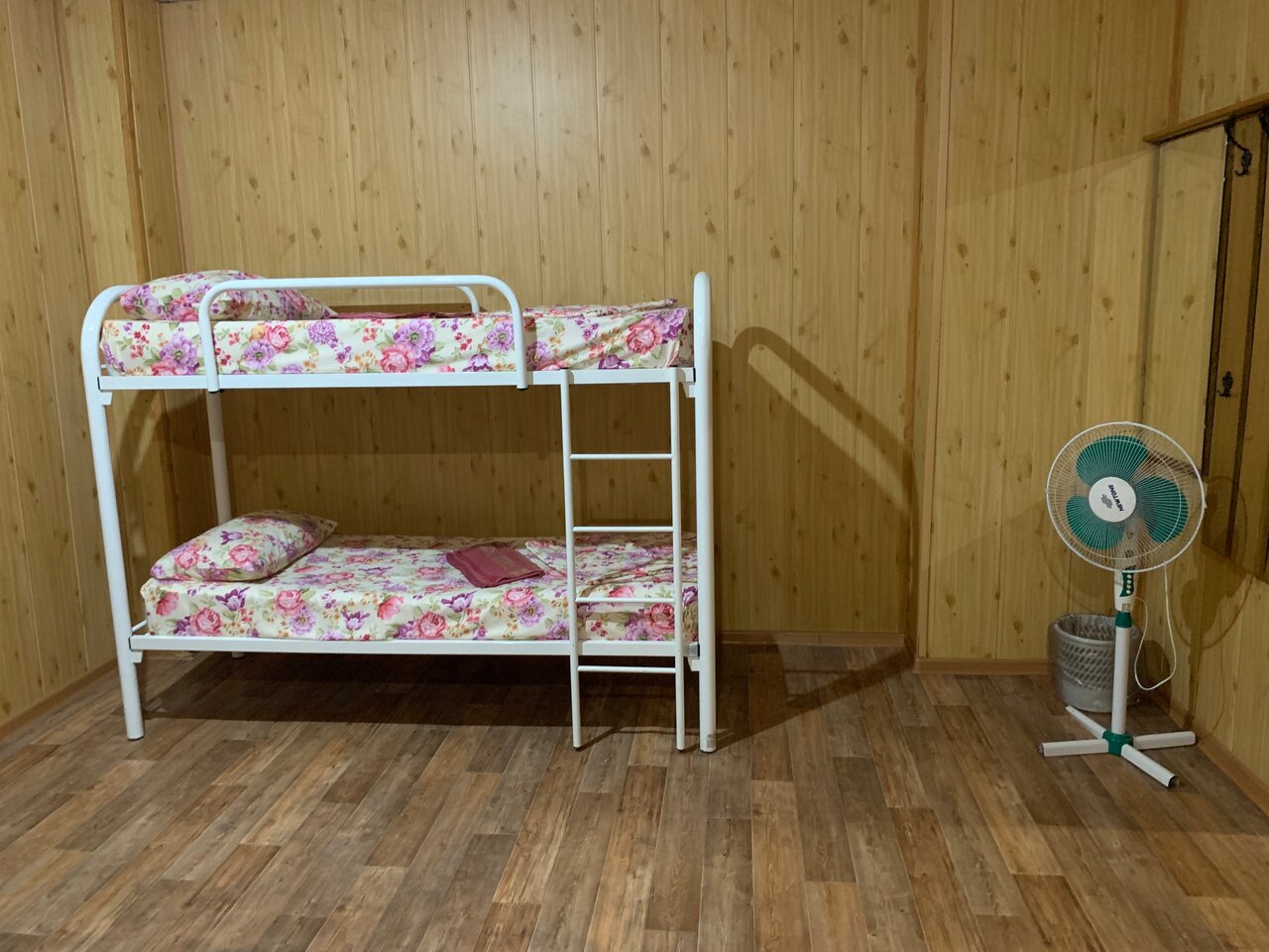Недорого, всё просто, тумбочка , кровать, телевизор, вентилятор, общий душ и туалет. Чтобы просто переночевать в дороге — самое то!
