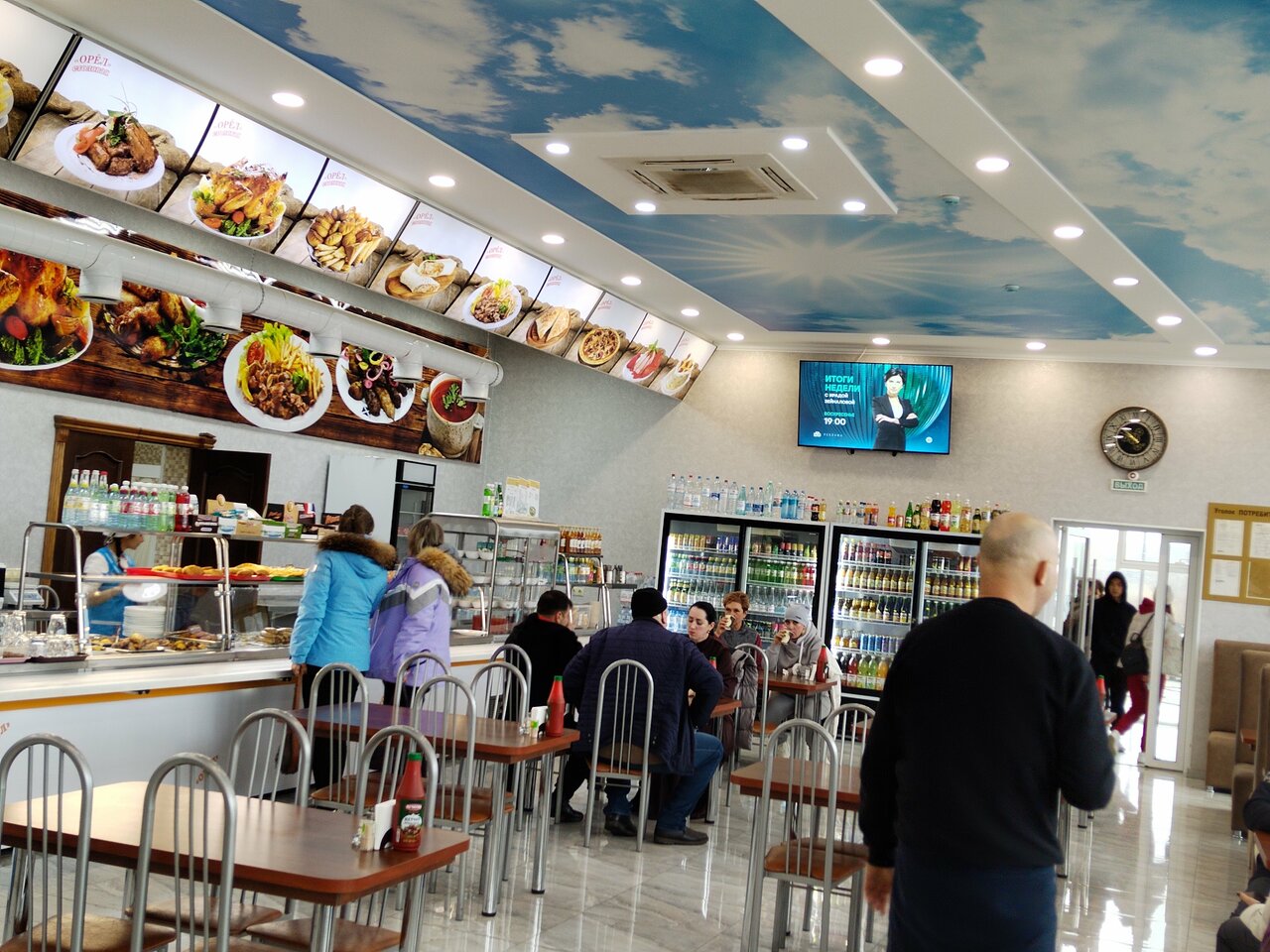 К сожалению, турфирма нам не оставила выбора и пришлось поесть, это громко сказано, в этом месте. Минусы: грязные столовые приборы, не свежий хлеб, из еды, все в панировке, не понятно когда еда приготовлена, а то что было на витрине не в панировке , видно было что заветрено уже, ничего не подписано, на вопрос , -Что это за блюда?, было такое выражение лиц у продавщиц, как будто пинкод от карты спросила а про цену можно только догадаться, тк блюдА без имянные В итоге, салат, картофель , без мяса, просто в подливке, и компот обошлись почти в 500 руб На вкус, нууу, помидоры и компот вкусный. Плюсы: хороший туалет Вывод: мы никогда не останавливались в этом заведении и не будем) Возможно это и прекрасное кафе, но, нам не повезло))