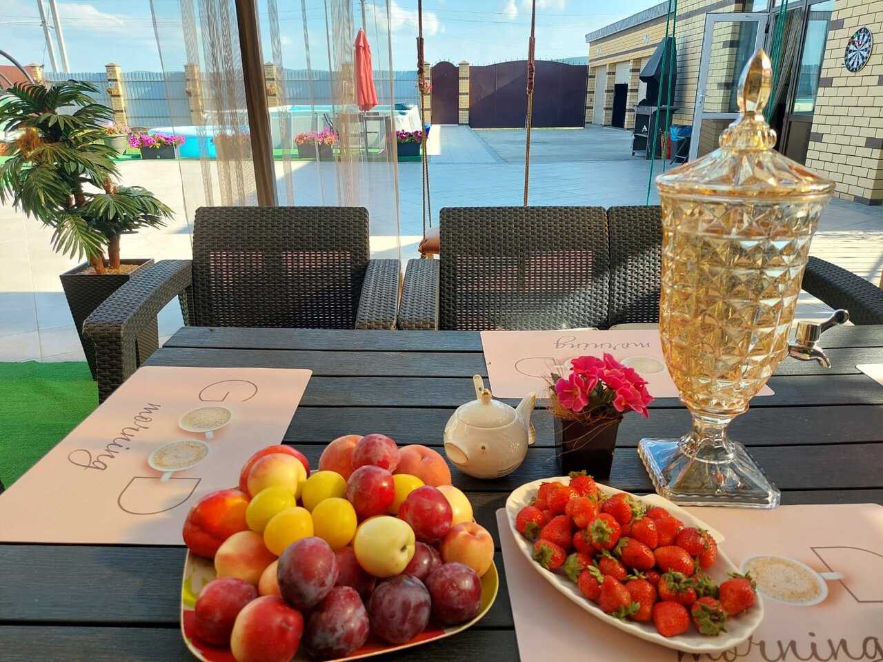 - Уютный двор с местами для отдыха (шезлонги, качели, лежаки).