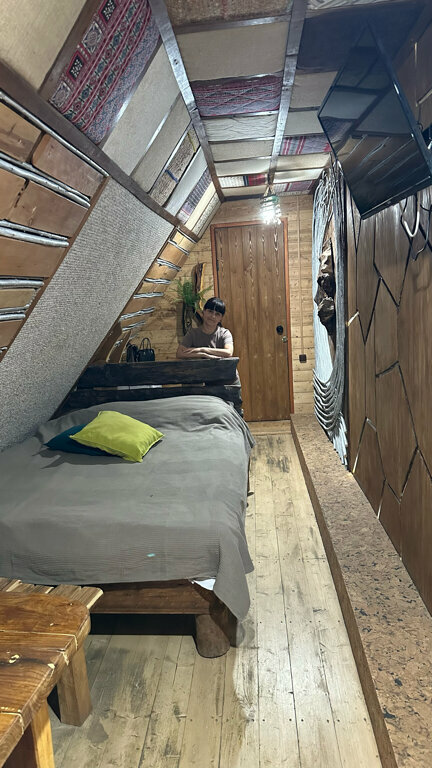 Понравилась кухня в ресто-кафе: сытно, вкусно, по адекватным ценам. В стоимость проживания входил завтрак: на выбор каша или яичница, чай или кофе, бличники. Номер уютный (жили в землянках), просторный. Не работал телевизор, но нам это не мешало. Насладились природой