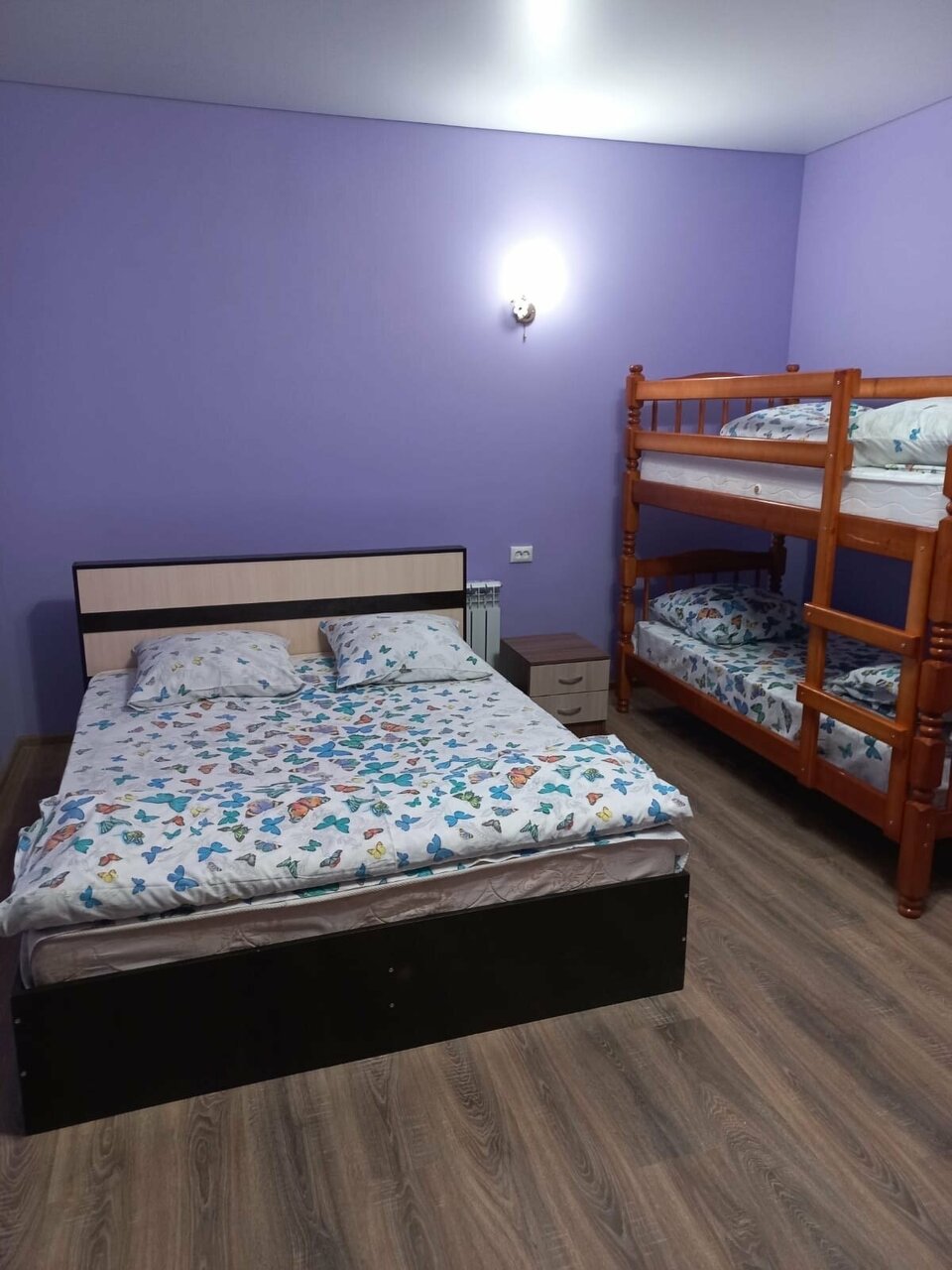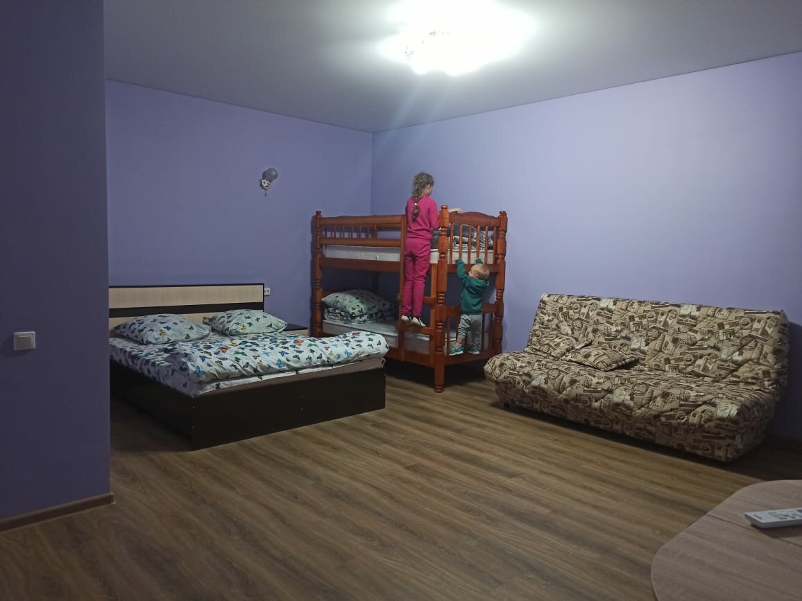 Семейный 6-ти местный номер со всеми удобствами.Кровати: 1 двуспальная, 1 двухъярусная, диван кровать.Удобства в номере: кондиционер, электрический чайник, холодильник, СВЧ печь, постельное белье, собственная ванная комната.