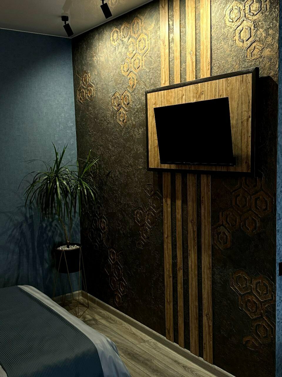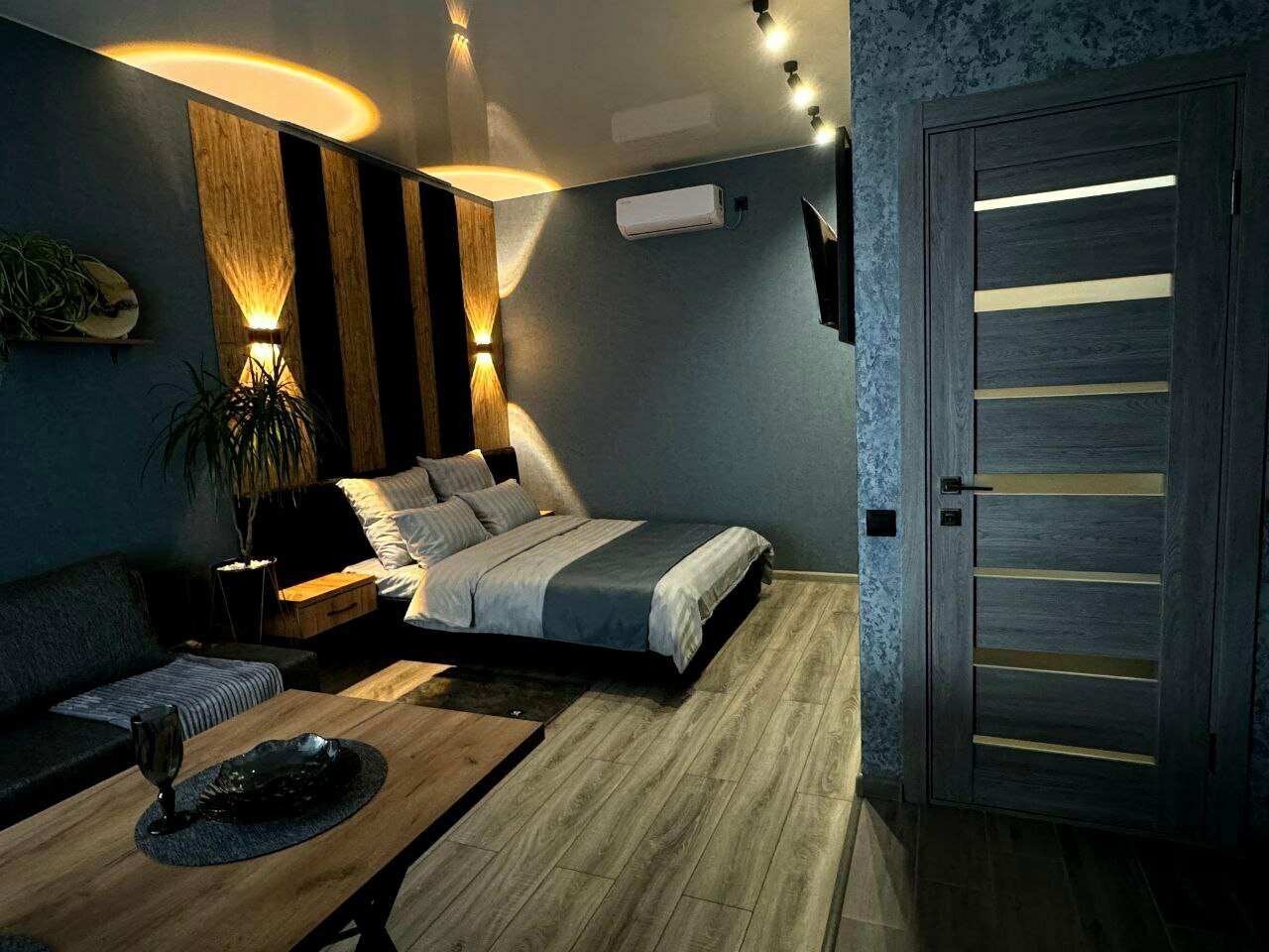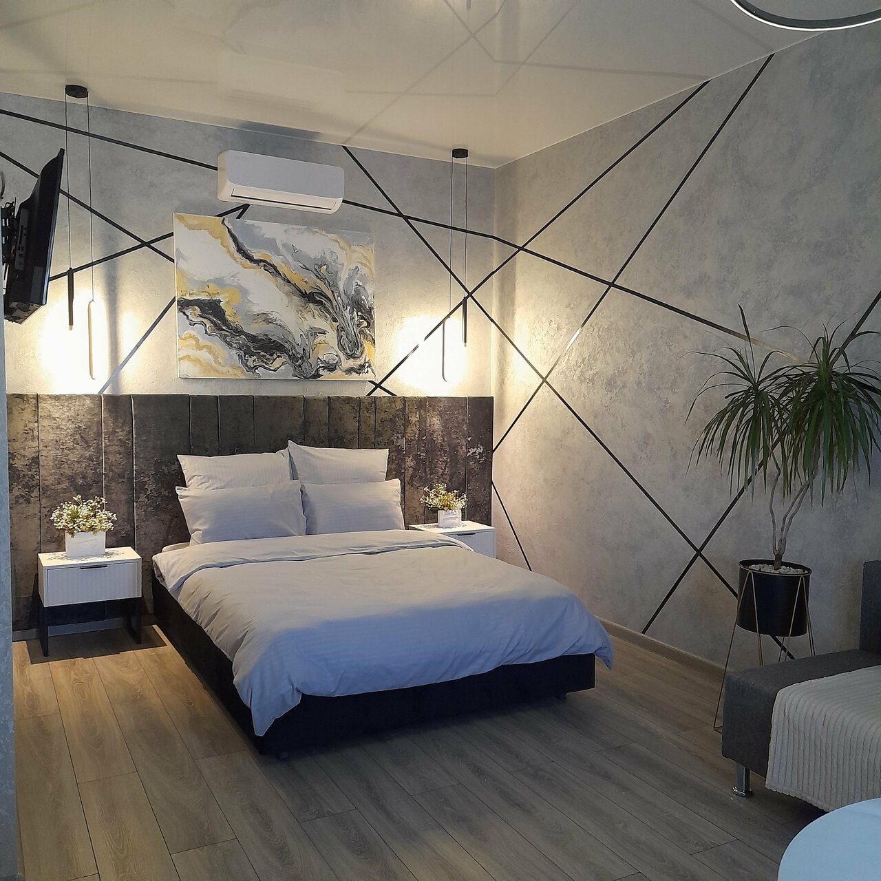 Номер в стиле лофт, сочетает в себе комфорт и современность. В интерьере использованы натуральные материалы: деревянные элементы, металлические детали и мягкие текстуры, которые дополняют друг друга.