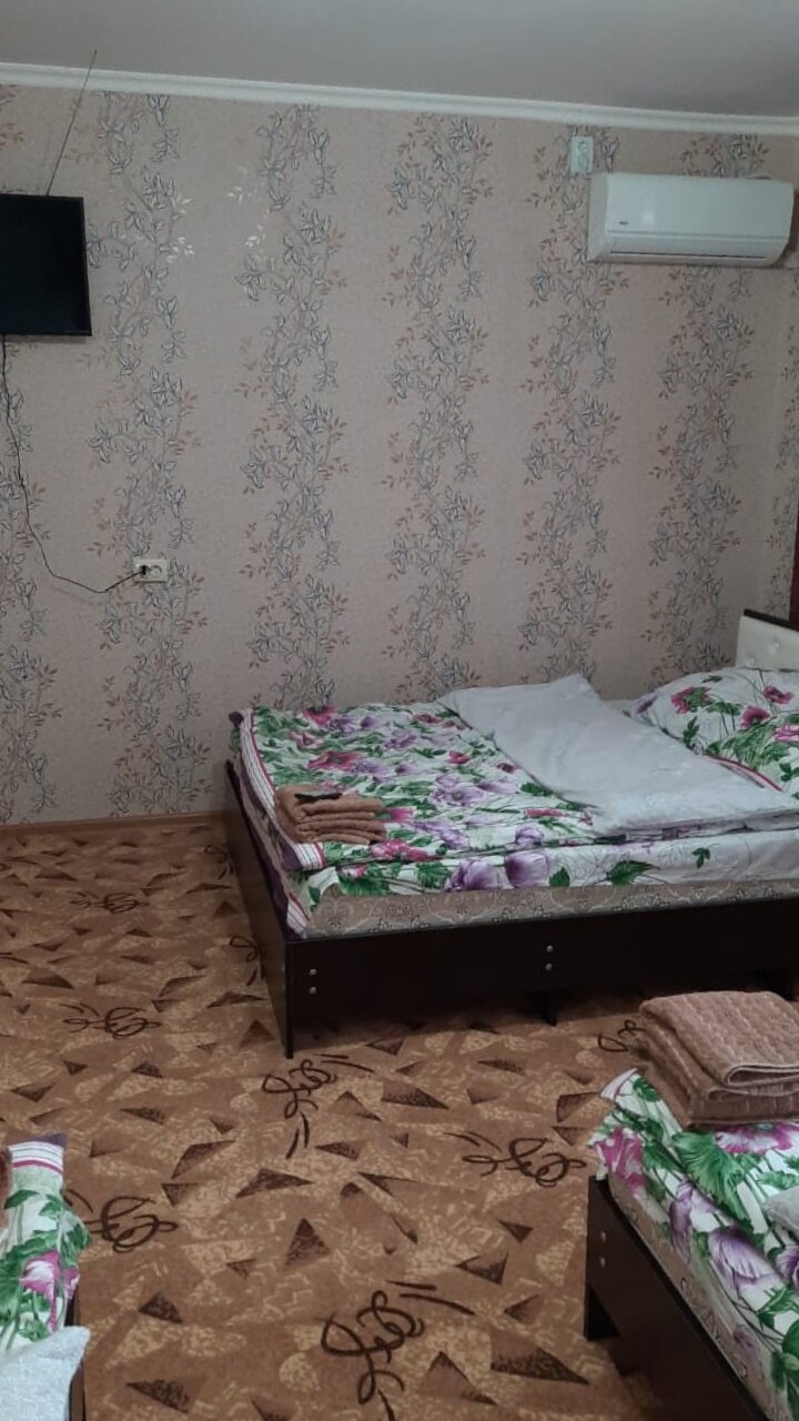 Номер чистый, уютный, без излишеств трёхместный, двуспальная кровать и односпальная. Есть небольшой санузел: туалет, душ. Вода чистая, не пахнет. Персонала не видела, хозяин добродушный, отзывчивый, спасибо ему. Всё чисто и аккуратно, всё новое. Нам понравилось.