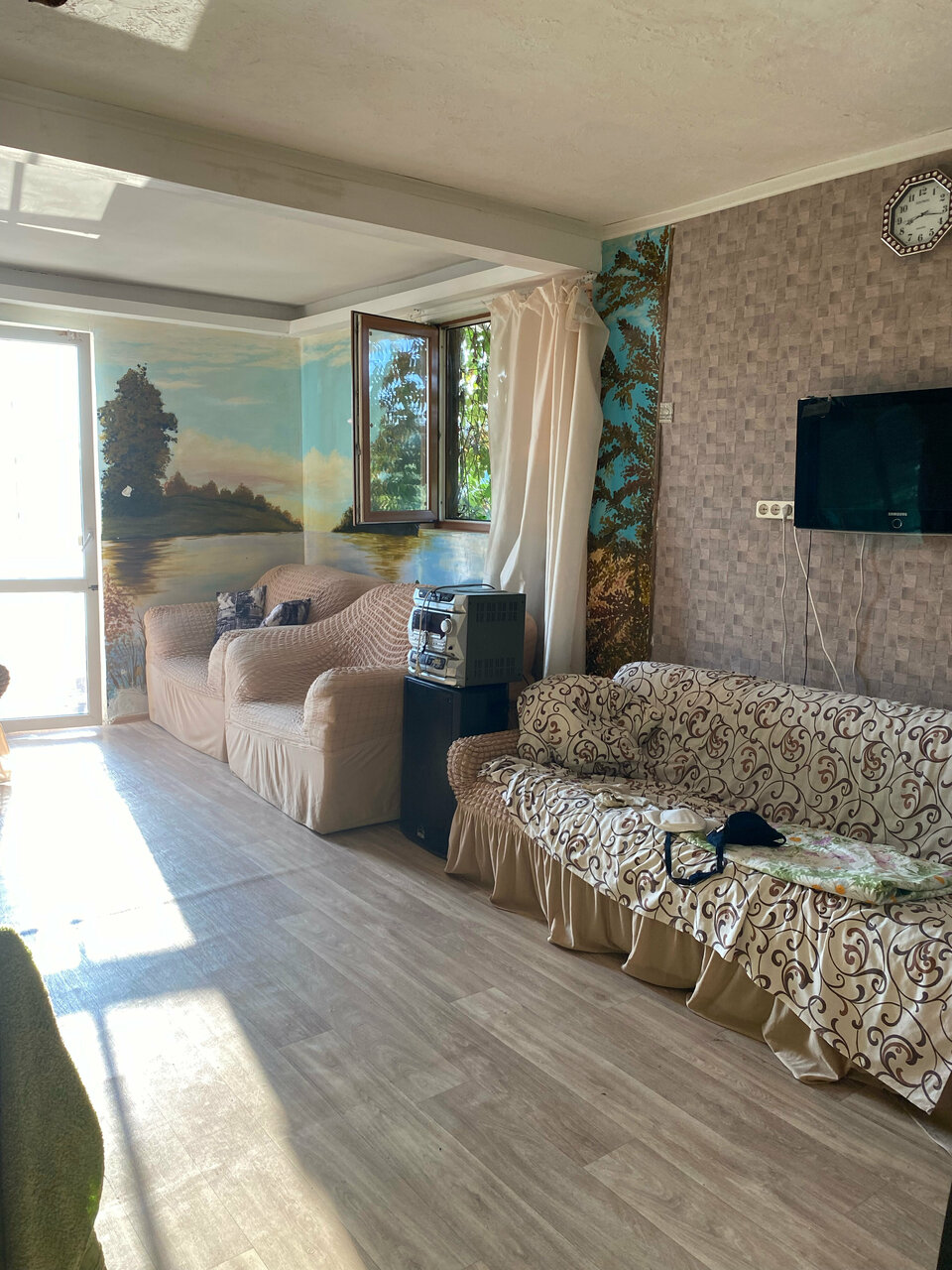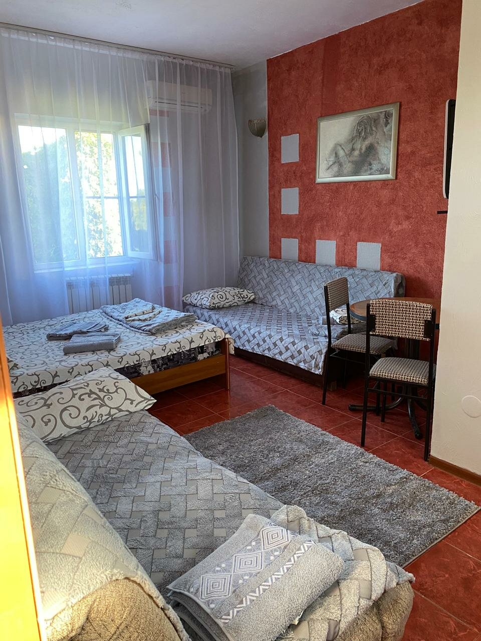 Ночью нашли по картам данное место) позвонила, уточнила цены и наличие мест, было 3 взрослых и 2 ребёнка 3 и 6)выделили комнату приятную, с 1 большой, 1 средней и 1 диваном котрый раскалывался(не понадобилось).комната обошлась в 2000. Места хватило всем. Душ, туалет в комнате, тесновтаый, но для того чтобы переночевать и помыться после дороги достаточно. Есть кондиционер и телевизор, на окнах сетка. Белье, полотенца чистые. Даже был детский шампунь, видимо после звонка подготовили. Хозяева замечательные, отзывчивые. Милый песик встречает при заезде) Территория большая, красивая, ухоженная, есть выход на водоём, катамараны, лодка) наслаждение для глаз