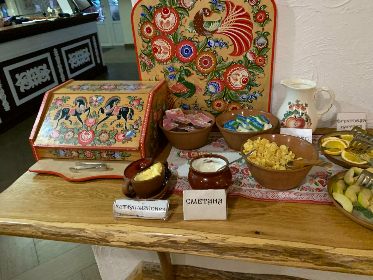 Отель в русском стиле, хороший дизайн и старинная атрибутика. Есть собственная парковка. Расположен на окраине города, среди хозяйственных объектов, склады и прочее. В номерах большая слышимость. Полотенца были грязные. Завтрак шведский стол, большой ассортимент, еда вкусная.