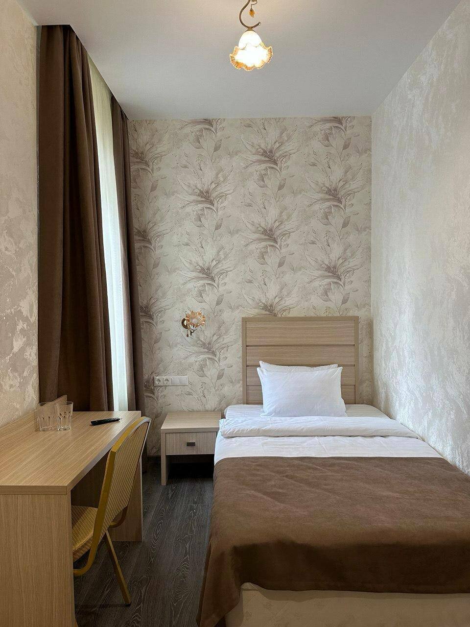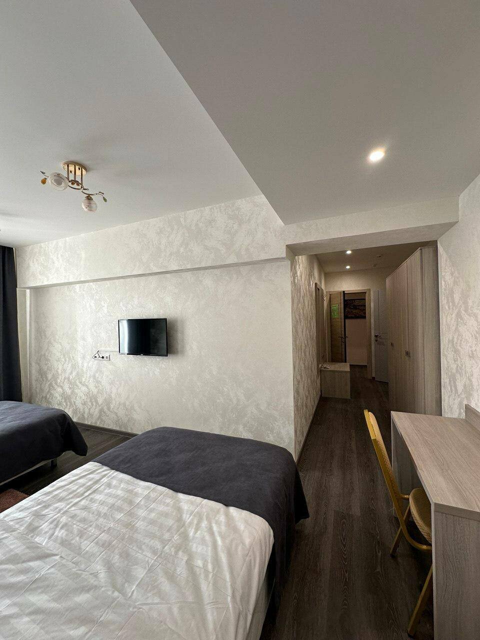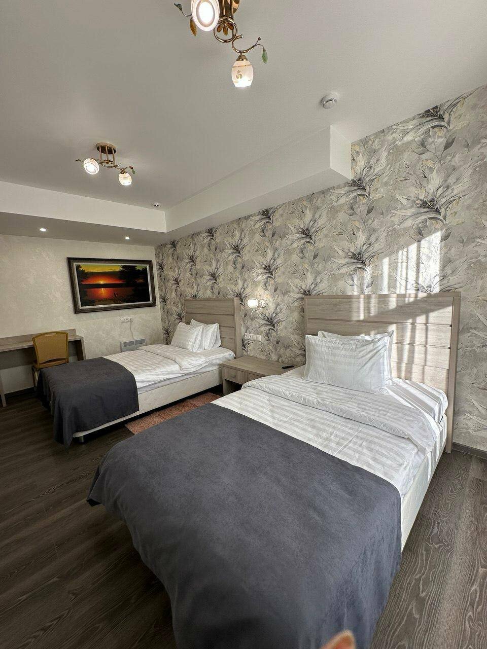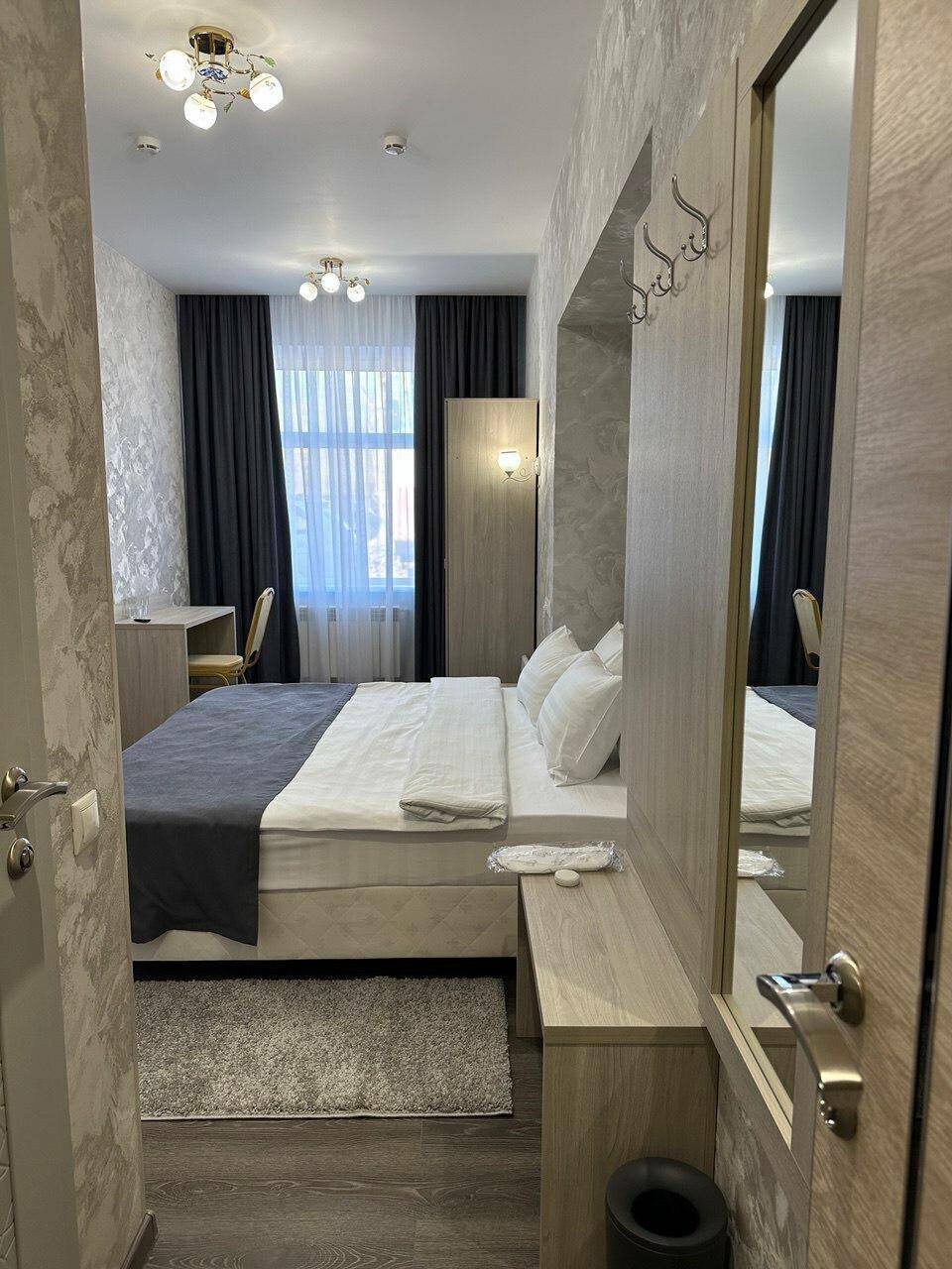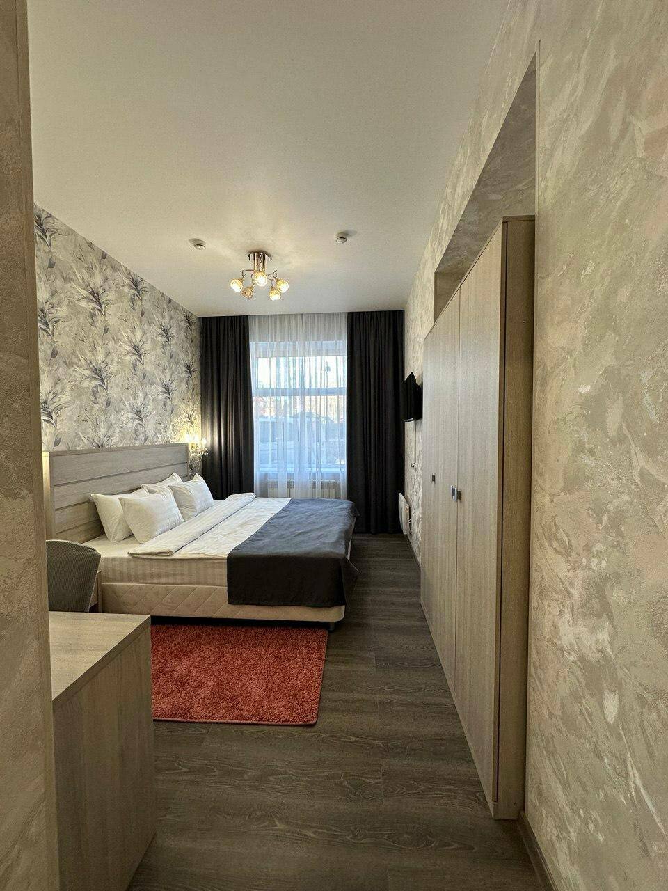 Уютный светлый номер с широкой двухспальной кроватью, идеально подходит как для отдыха, так и для бизнес-поездки. В номере есть телевизор, ванная комната, полотенца, халаты, чайник, холодильник. Завтрак входит в стоимость проживания.