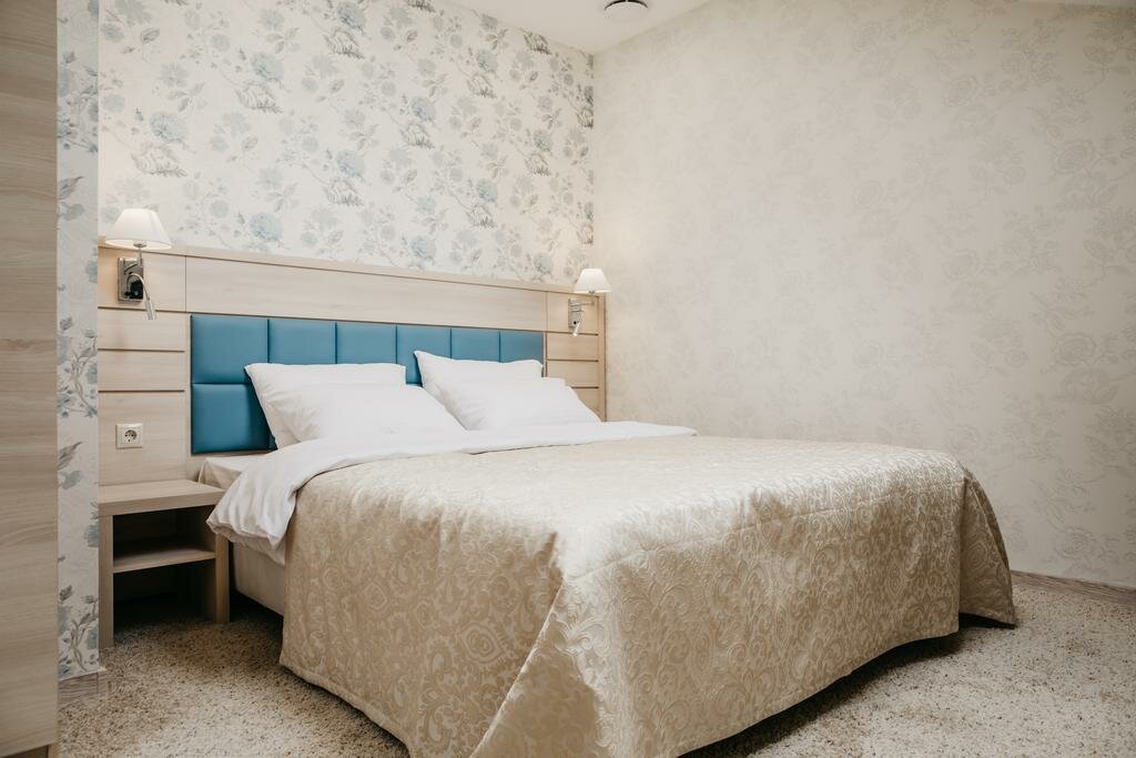 Двухместный номер с двухспальной кроватью. В номере чайник, холодильник, душ, санузел, туалетные принадлежности, полотенца, халаты, тапочки. В стоимость входит завтрак.