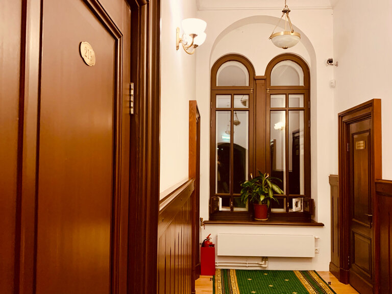 Здание старинное, стены толстые. В номерах чисто. Душ не во всех номерах, но есть общий. Мебель из дерева. Кровати не скрипят.