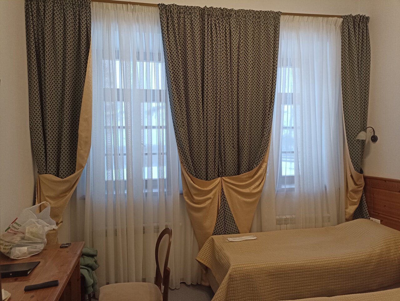 Комфортная, удобно расположена. Имеется комната приема пищи с микроволновкой и чайником, чисто, свежий ремонт. В номере телевизор, холодильник, фен. Маловато розеток — только по количеству бытовой техники, лучше иметь с собой тройник. командированным лучше сразу предупредить о необходимости справки, делают долго, но могут выслать по почте. В монастыре можно заказать экскурсию, там же есть хорошая Трапезная (с 10 до 17/18) и Вареничная (с 11 до 17).