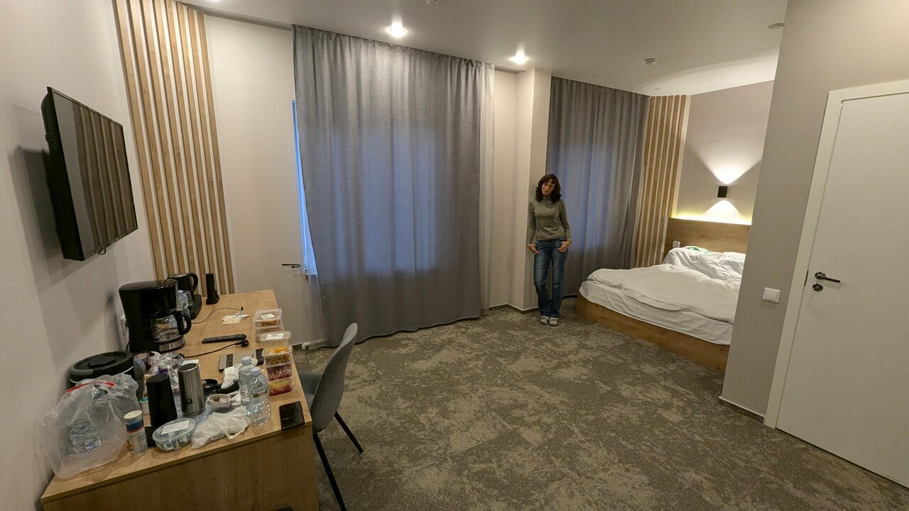 Новый ремонт и мебель. Белье свежее, в душе — одноразовые мыло и шампунь. Хороший завтрак, дружелюбный персонал. В номере чайник, фен и холодильник. Было жарко, пришлось выключать батарею. По виду, шумоизоляция должна быть на уровне, так как стены кирпичные, толстые, потолки высокие. На практике не довелось испытать, так как во всем отеле мы были одни. Сказываются санкции. Нам всё понравилось. Из минусов только довольно далеко от границы, но на машине это не проблема. Перед отелем небольшая неохраняемая стоянка.