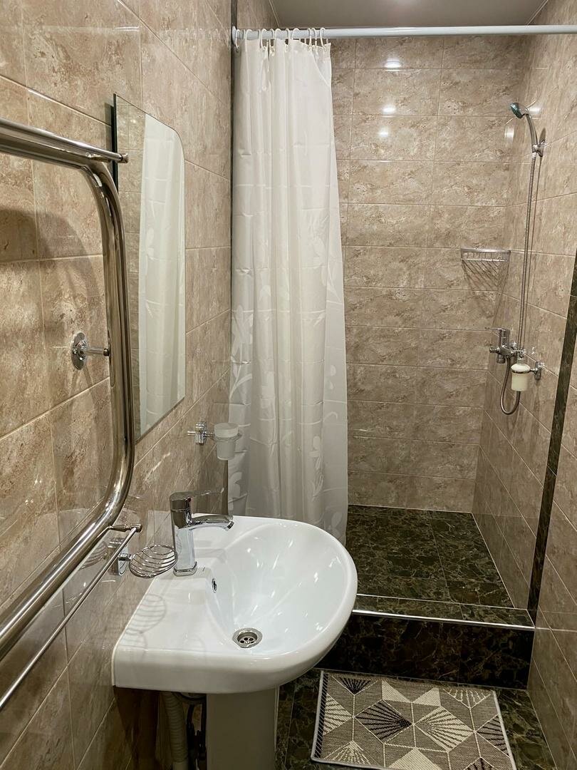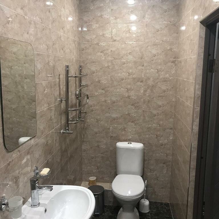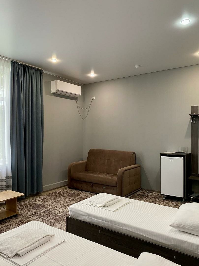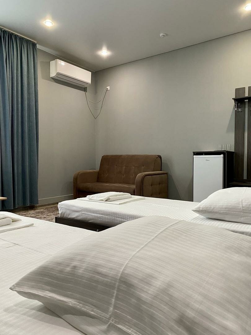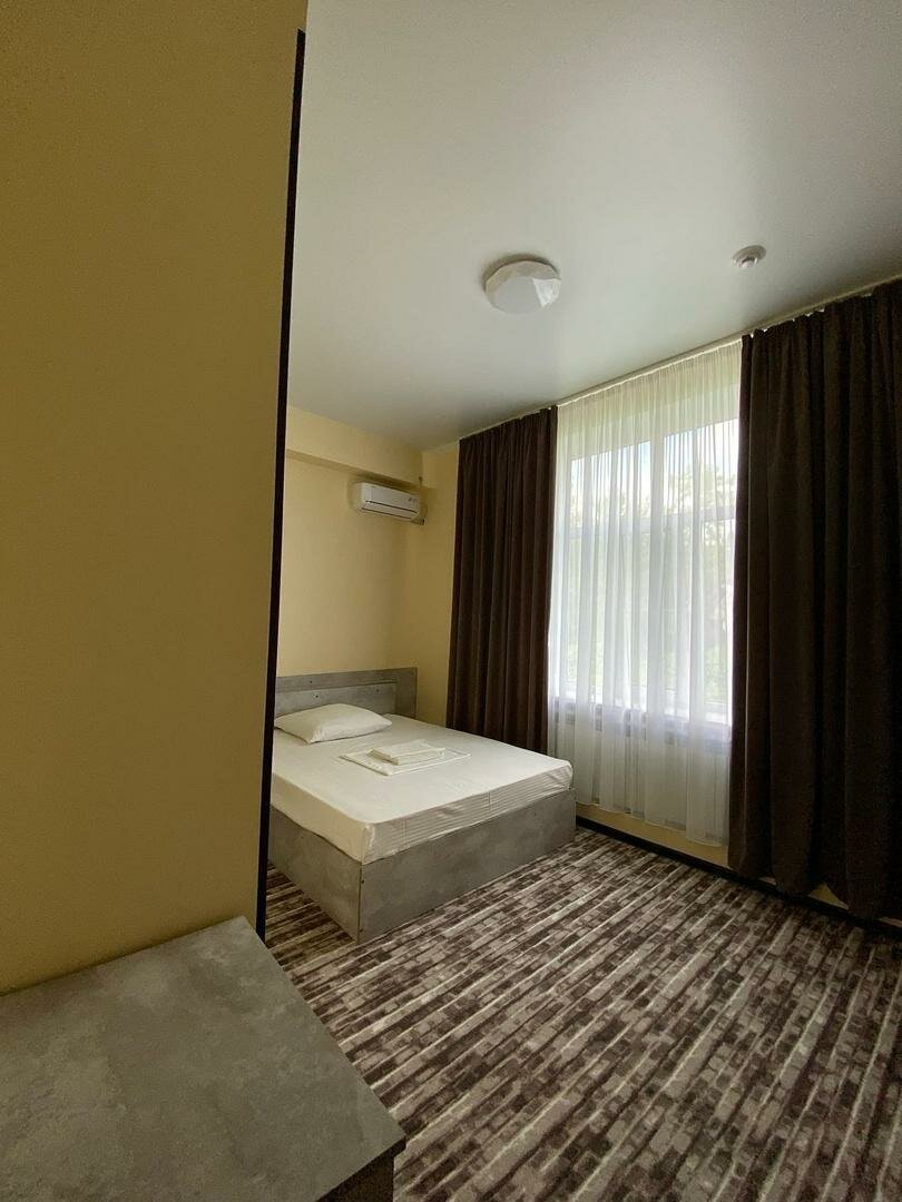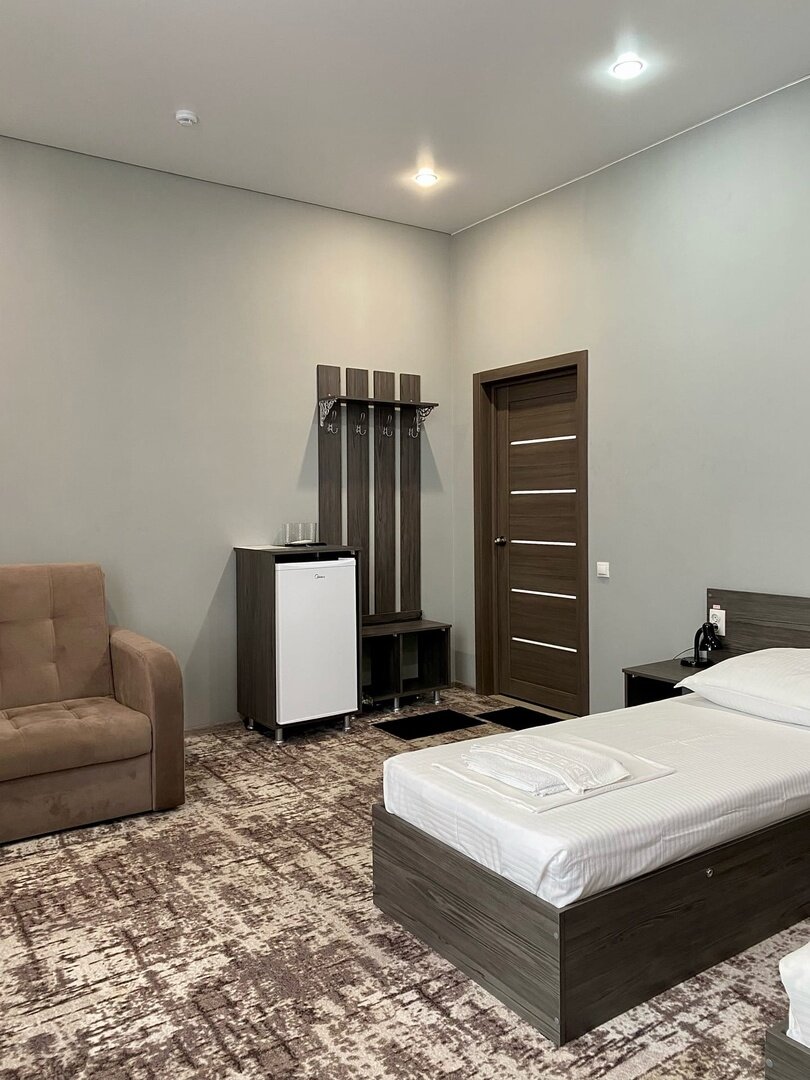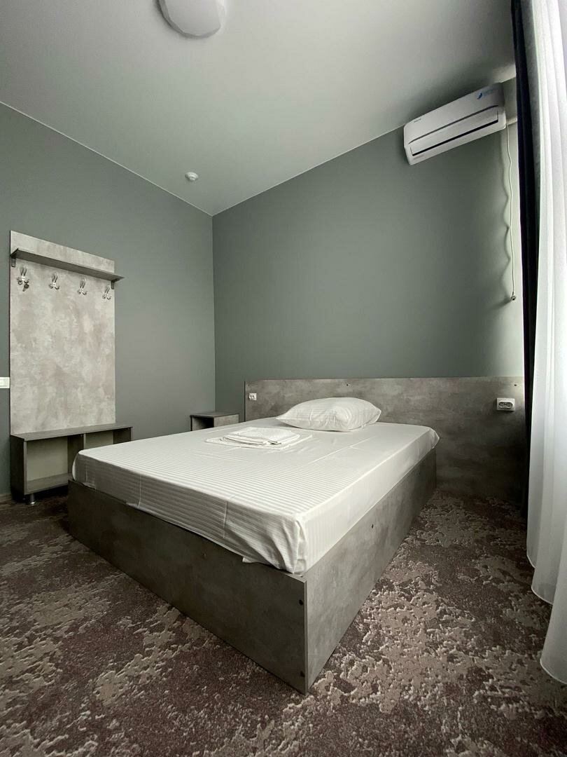 Номер просторный, чистый. Есть кондиционер, холодильник (шумный). Полотенца мягкие, постельное белоснежное. Кровать большая и удобная. В ванной все намыто и натерто до блеска. Есть шампунь и гель для душа, тапочки. У входа парковка. Интернет быстрый — нужен был по работе, волновалась, хватит ли скорости, но все ок. Нет завтрака, но есть кухня общего пользования со всем необходимым. Девочка администратор подсказала ближайшие магазины и кулинарию, где можно купить вкусные готовые блюда. Администратор вежливая и приветливая, готова ответить на вопросы.