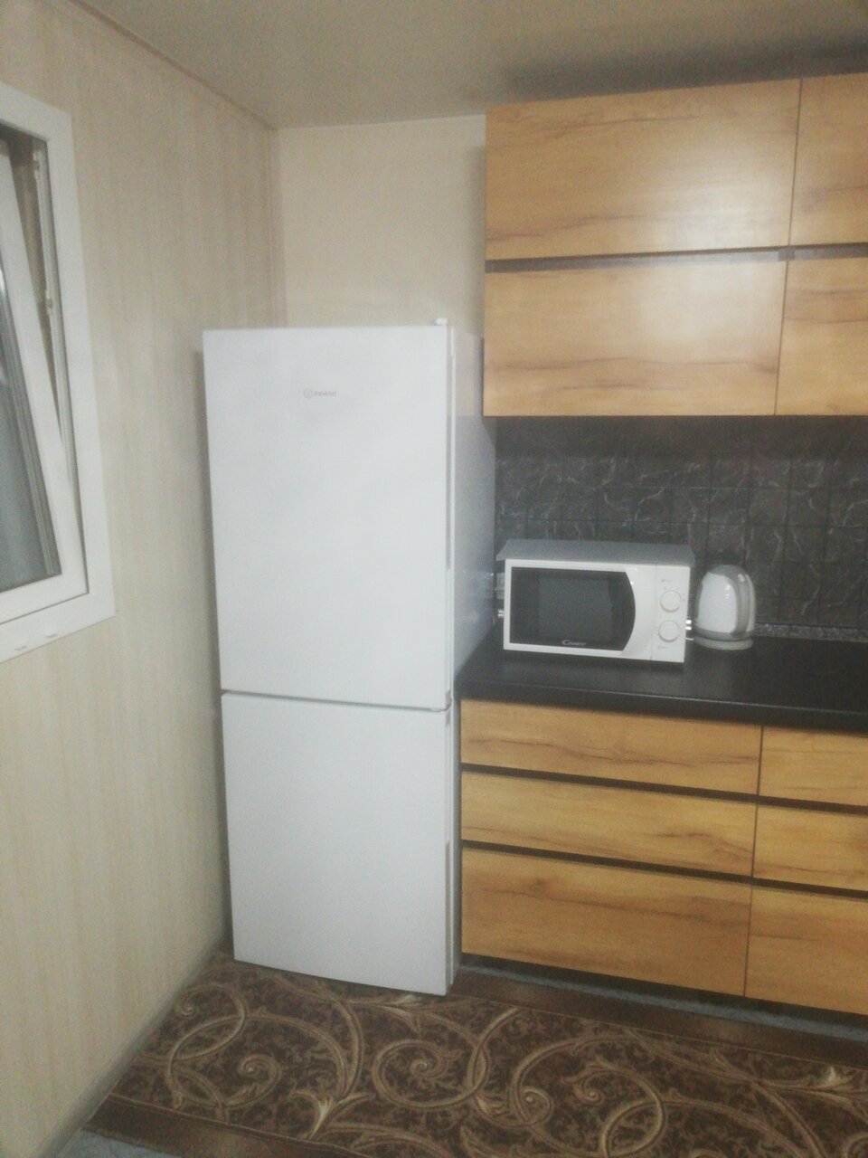 - Наличие всей необходимой бытовой техники (холодильник, варочная панель, микроволновка, посуда).