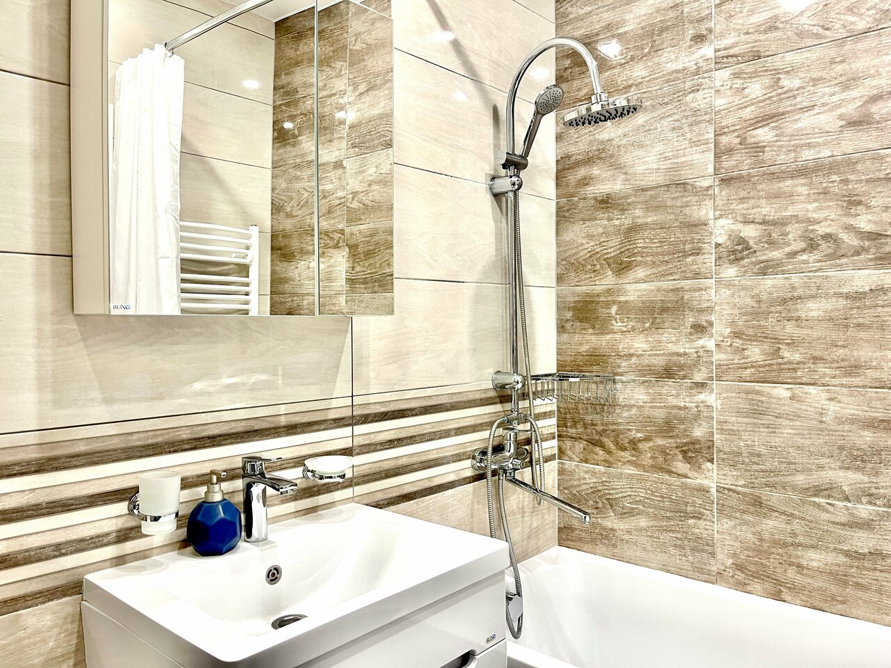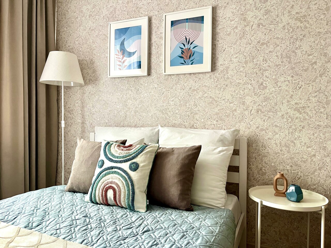Очень понравилась квартира! Продумано все до мелочей, есть много всего, чего могло бы не быть, включая специи, масло, аптечку, зонтик, ложку для обуви, швейный набор и тд. Диван в спальне был другой, нам он намного больше понравился по факту, чем на фото. Дом новый, свежий, закрытая территория, отличная большая площадка для детей. Дом находится на берегу пруда, в самом центре. Все достопримечательности и хорошие ресторанчики рядом. Очень отзывчивый администратор от Apartmari всегда была на связи в вотсап при любых вопросах. Получилось более чем комфортное пребывание!