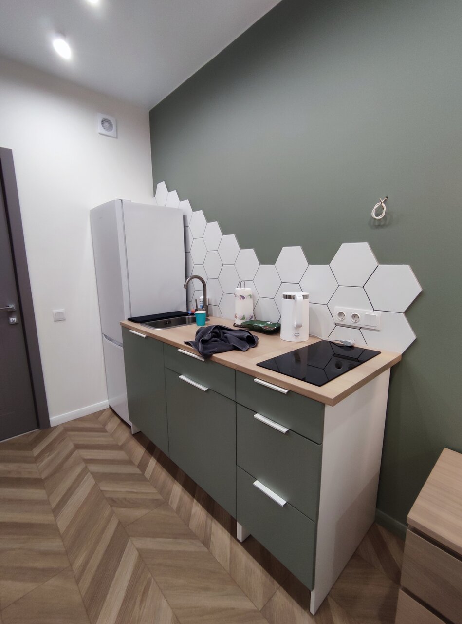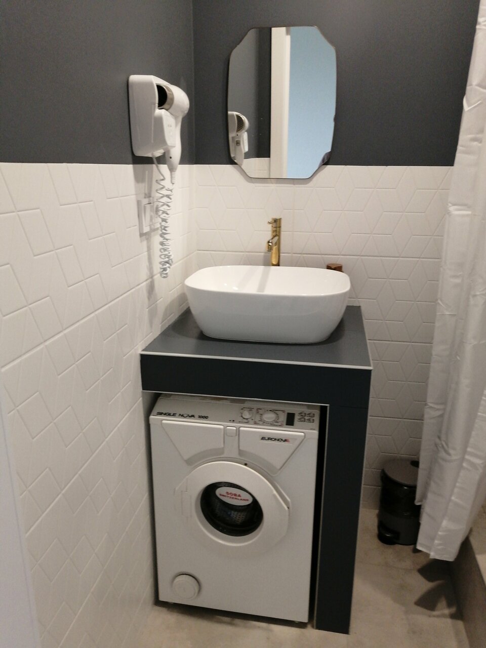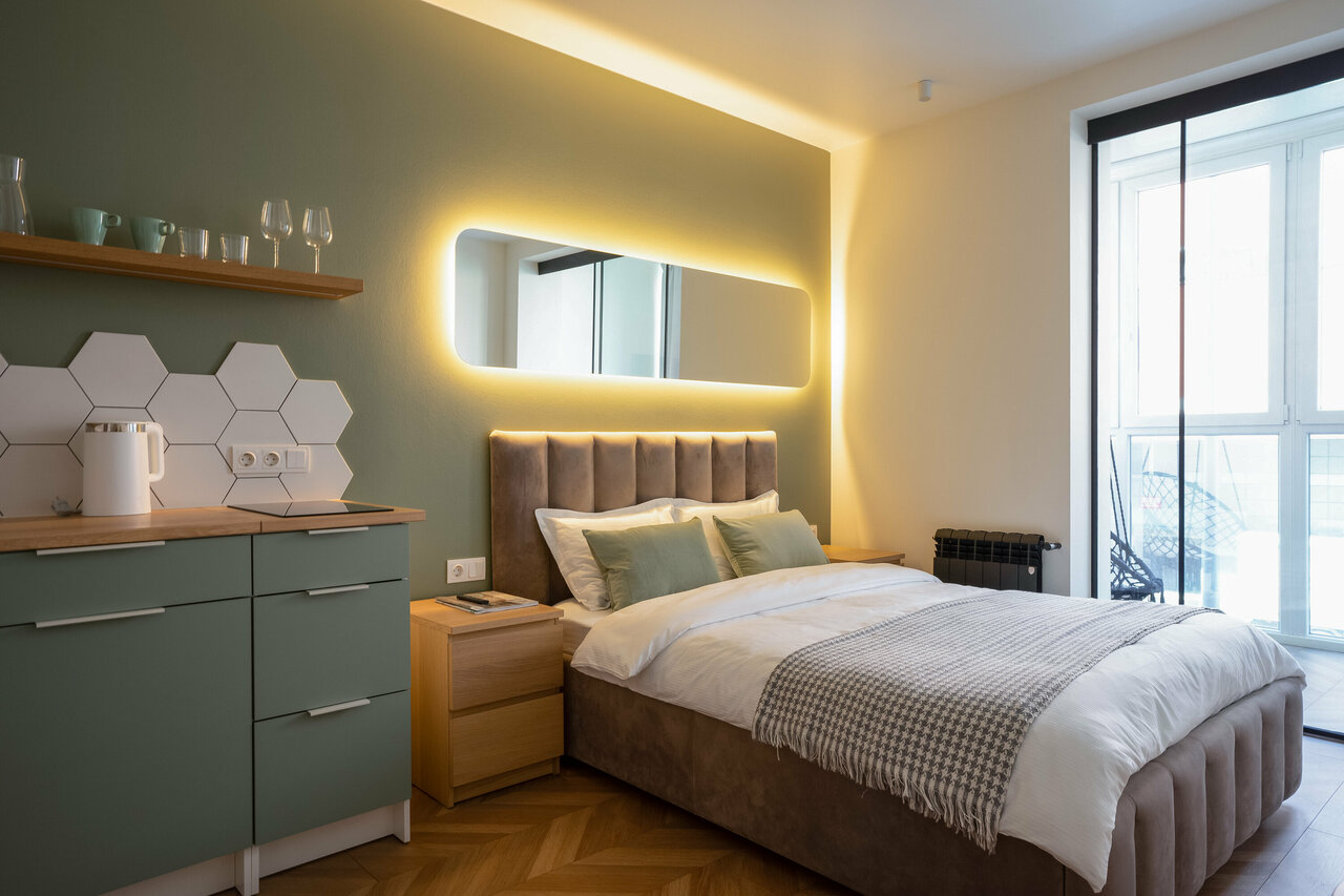Проживали вдвоем у Северного вокзала в оливковой студии. Нам все очень понравилось! Во-первых много места, комната просторная, во-вторых хозяева позаботились о том, чтобы было все необходимое — утюг, лекарства, ватные диски, чай, кофемашина — вещи, о которых не подумаешь даже спросить иногда, но так приятно, когда они есть. Удобное бесконтактное заселение и выселение, в номере было чисто и уютно, в общем, рекомендую:)