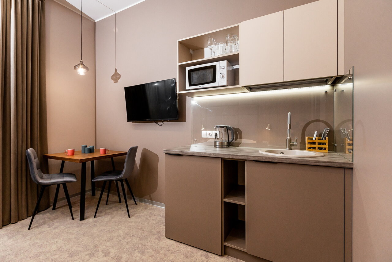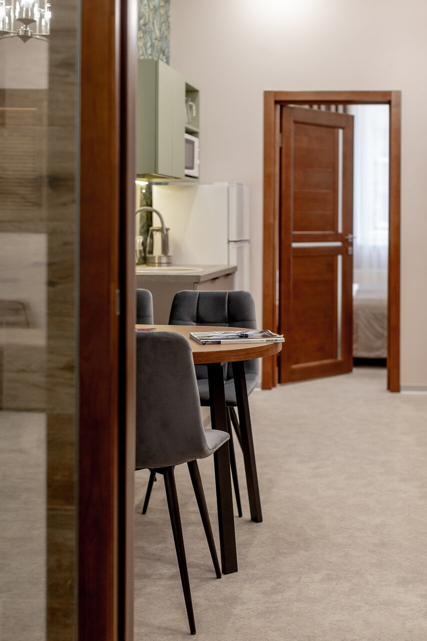 Отличный персонал, удобное расположение, уютная атмосфера. Есть внутренний двор с детской площадкой и фитнес снарядами. Рядом так же есть аппартаменты