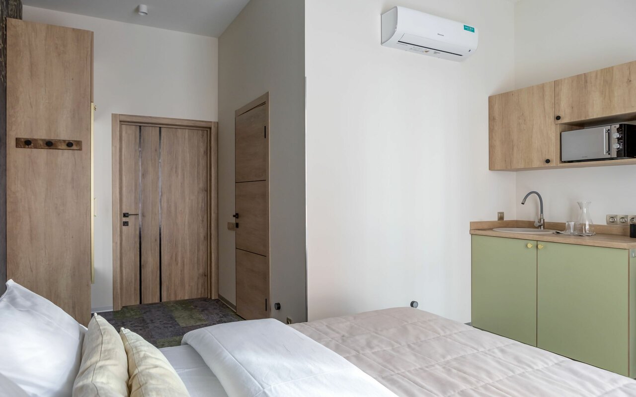 Отличный небольшой отель с очень приветливым и дружелюбным персоналом: со всем помогут, всё подскажут. Номер чистый и уютный, с новой мягкой и удобной мебелью, есть мини-кухня с микроволновкой и холодильником, набор посуды и столовые приборы.А так же чай,кофе.Расположение отеля очень хорошее,до центра минут 15-ть. Отель-соотношение цена-качество.Однозначно рекомендую.
