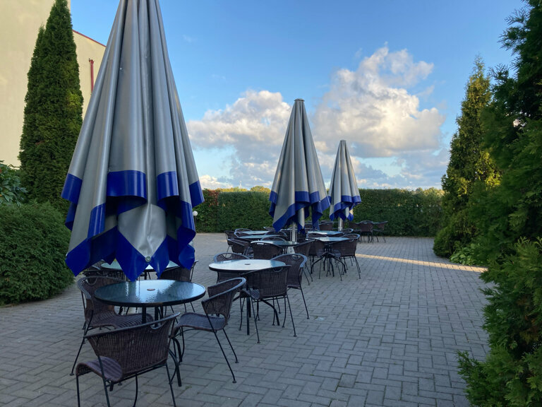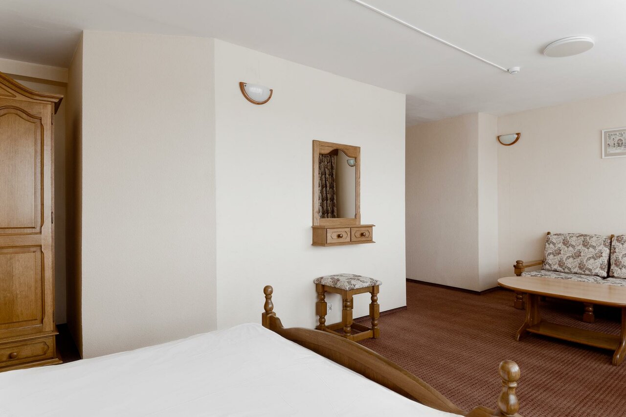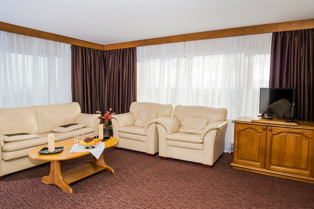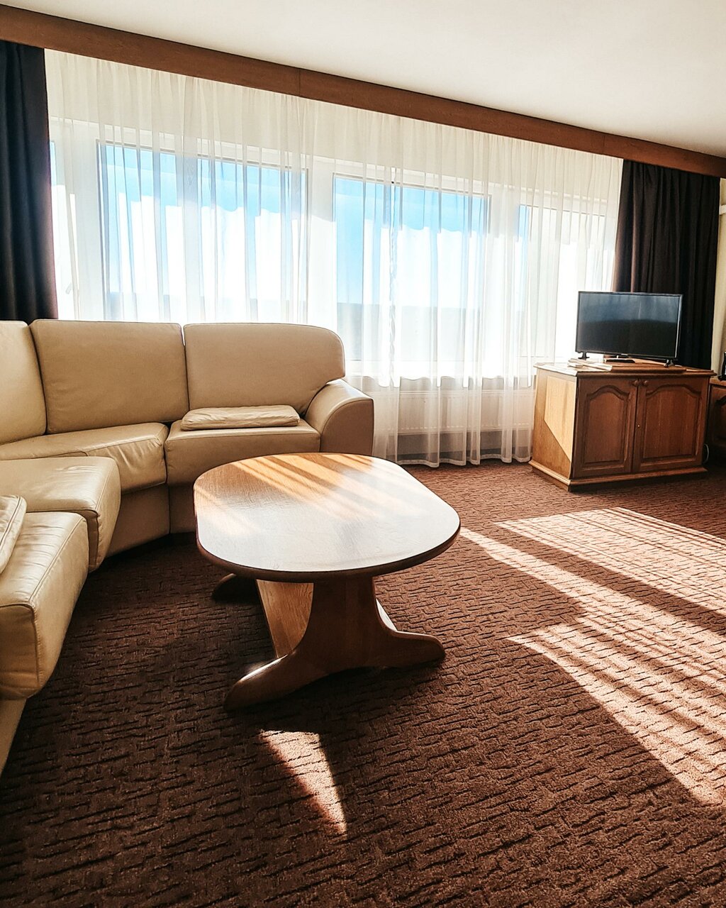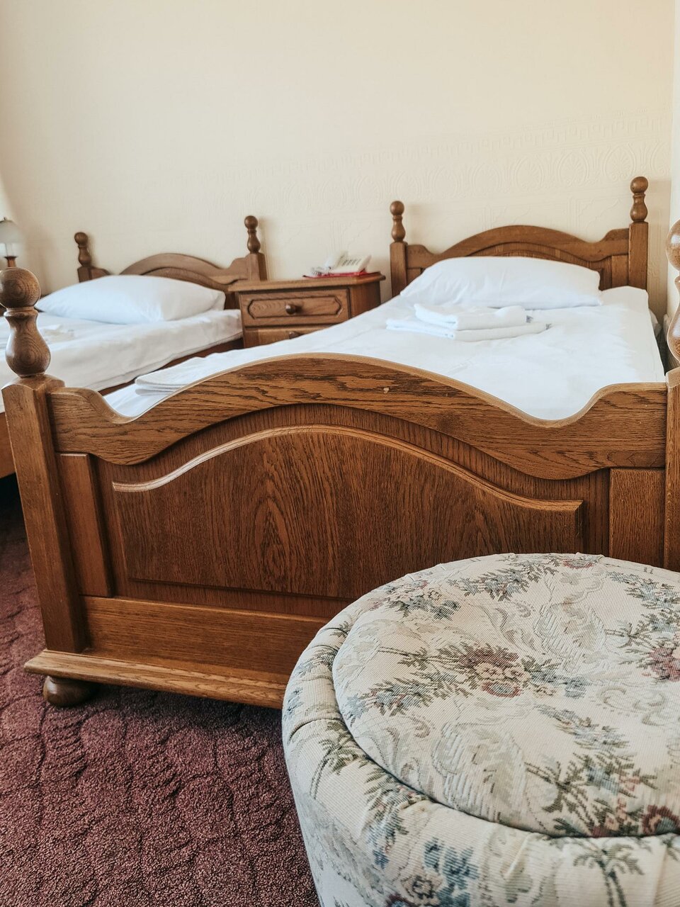 Гостиница хорошая. Большая. За чертой Калининграда. Завтраки супер. Номера поюзаные. Белье чистое. Ковровое покрытие грязное. Мебель старая. Ресепшн на втором этаже. Лифт с первого на второй не поднимает. По лестнице пешком с тяжелым чемоданом — отвратительно. Администраторы на ресепшн неприветливые, с кислыми лицами. Короче, вся гостиница из прошлого вместе с администраторами. Но жить можно. Позавтракать хорошо. Доехать до центра на автобусе 25 мин. С тетками на ресепшн минимум общения. И норм тогда.