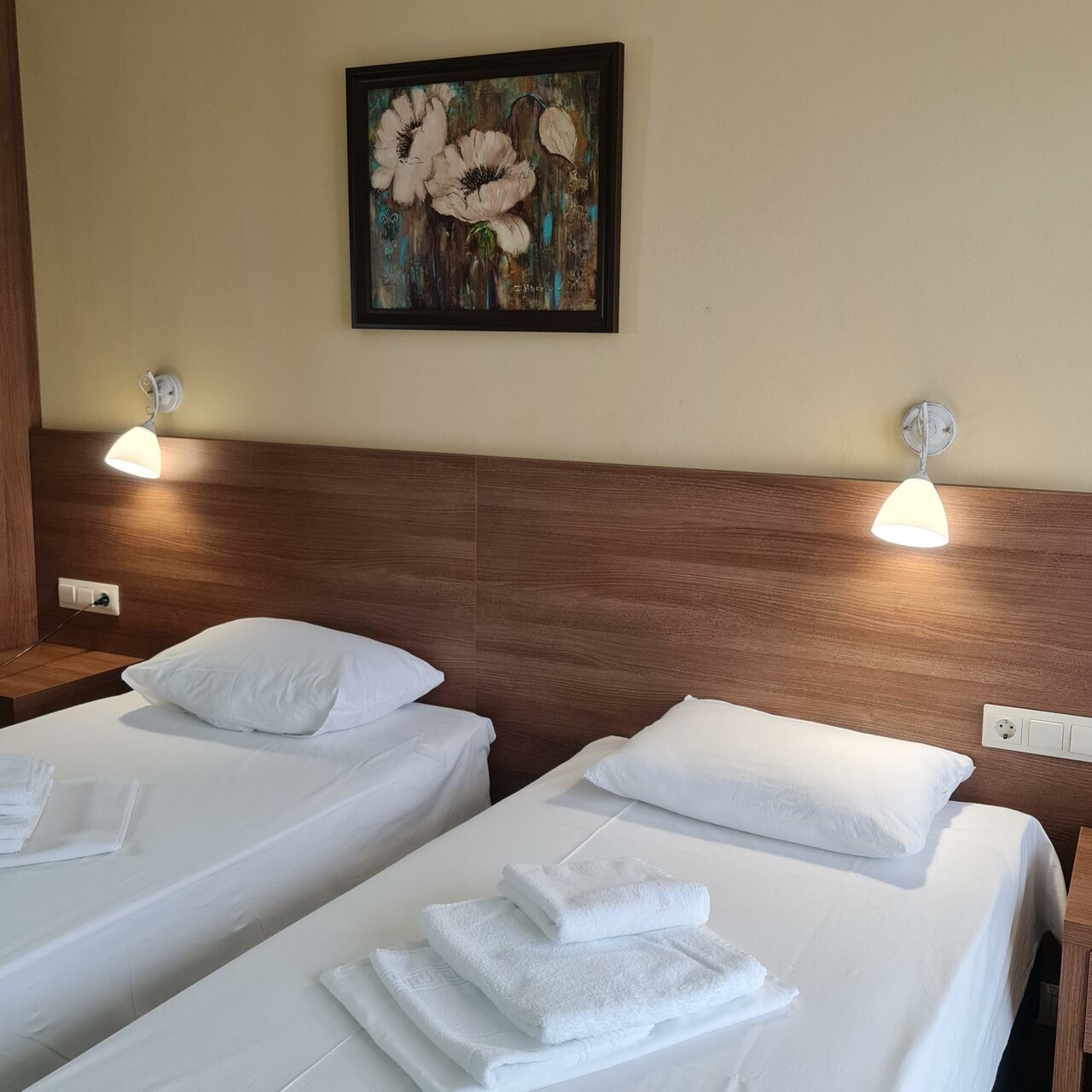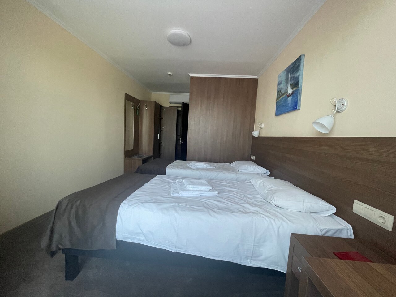 Отдыхали с супругой 22.06.2024г. Отель позиционирует себя как 3 звезды. Максимум 1. Приехали в отель 15-30,номер был не готов. Ресторан и кафе были заняты корпоративами. Кормить нас отказались пришлось ехать в город. В правилах отеля сказано: замена белья 1 раз в 3 дня. Были 6 ночей не поменяли не разу.( ладно хоть полотенца меняли). Внятного ответа от администрации мы не получили. В номере стены, потолок в следах раздавленных насекомых. Ковролин на полу грязный в каких-то пятнах, не разу не пропылесосили. 2 лифта, когда выезжали в 12-00 работал только один (как специально). Уехали только с 4 раза.