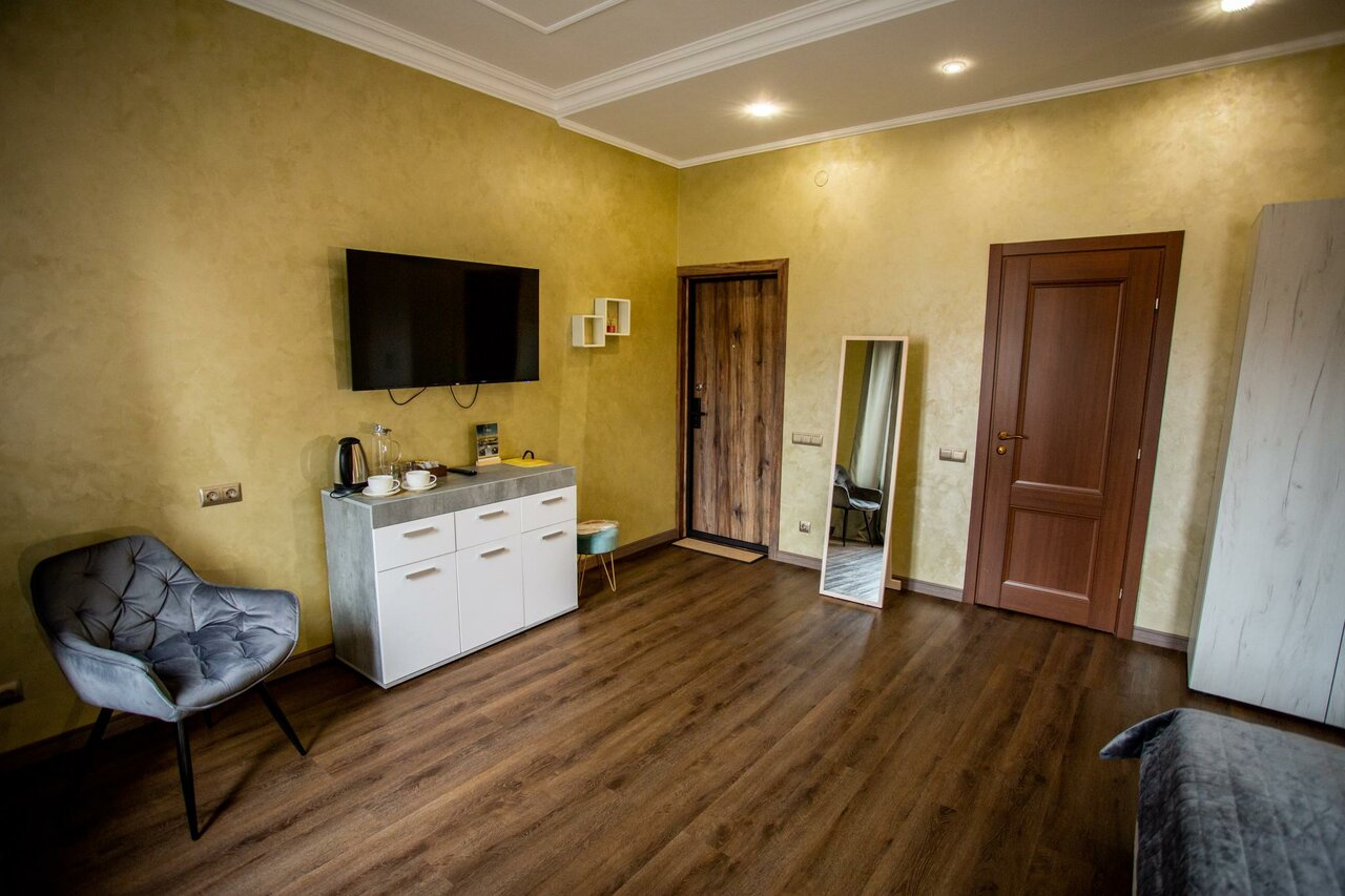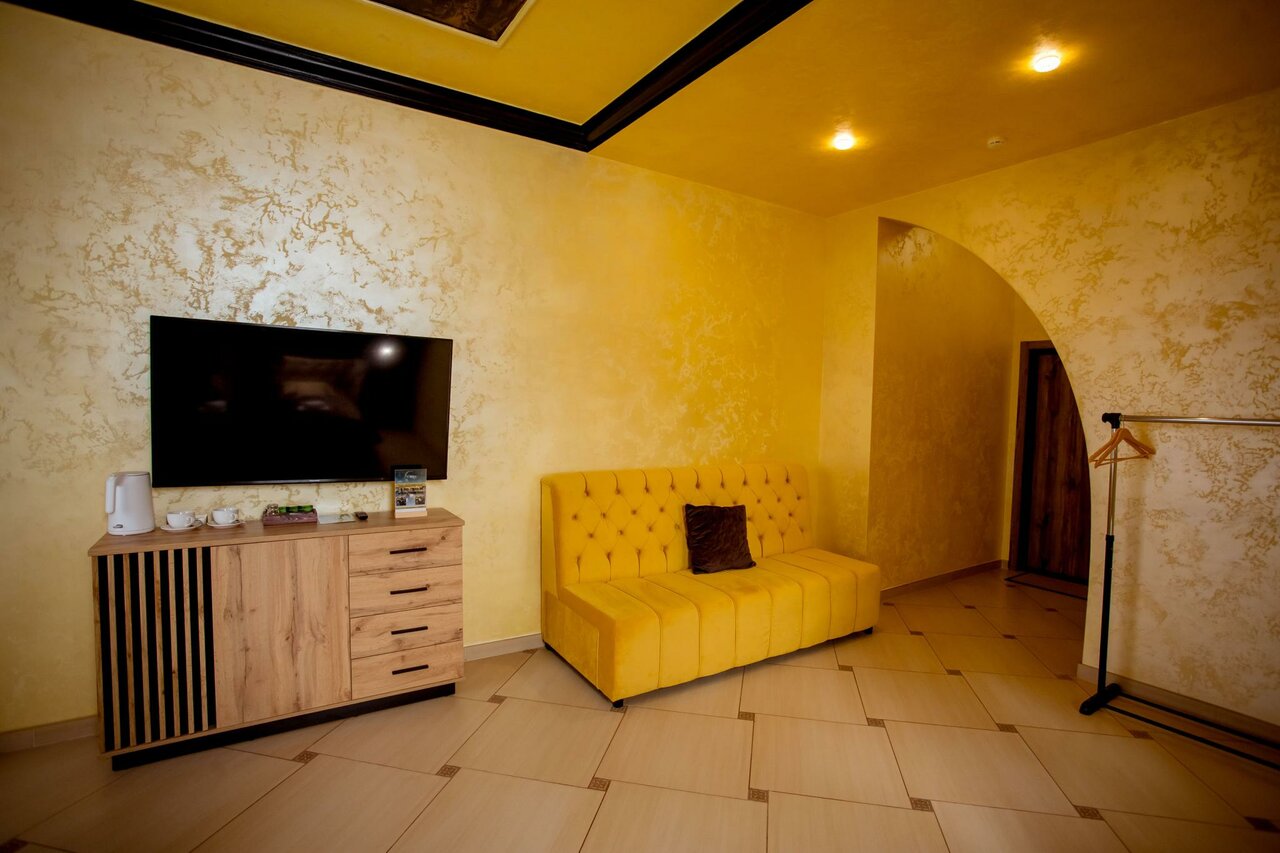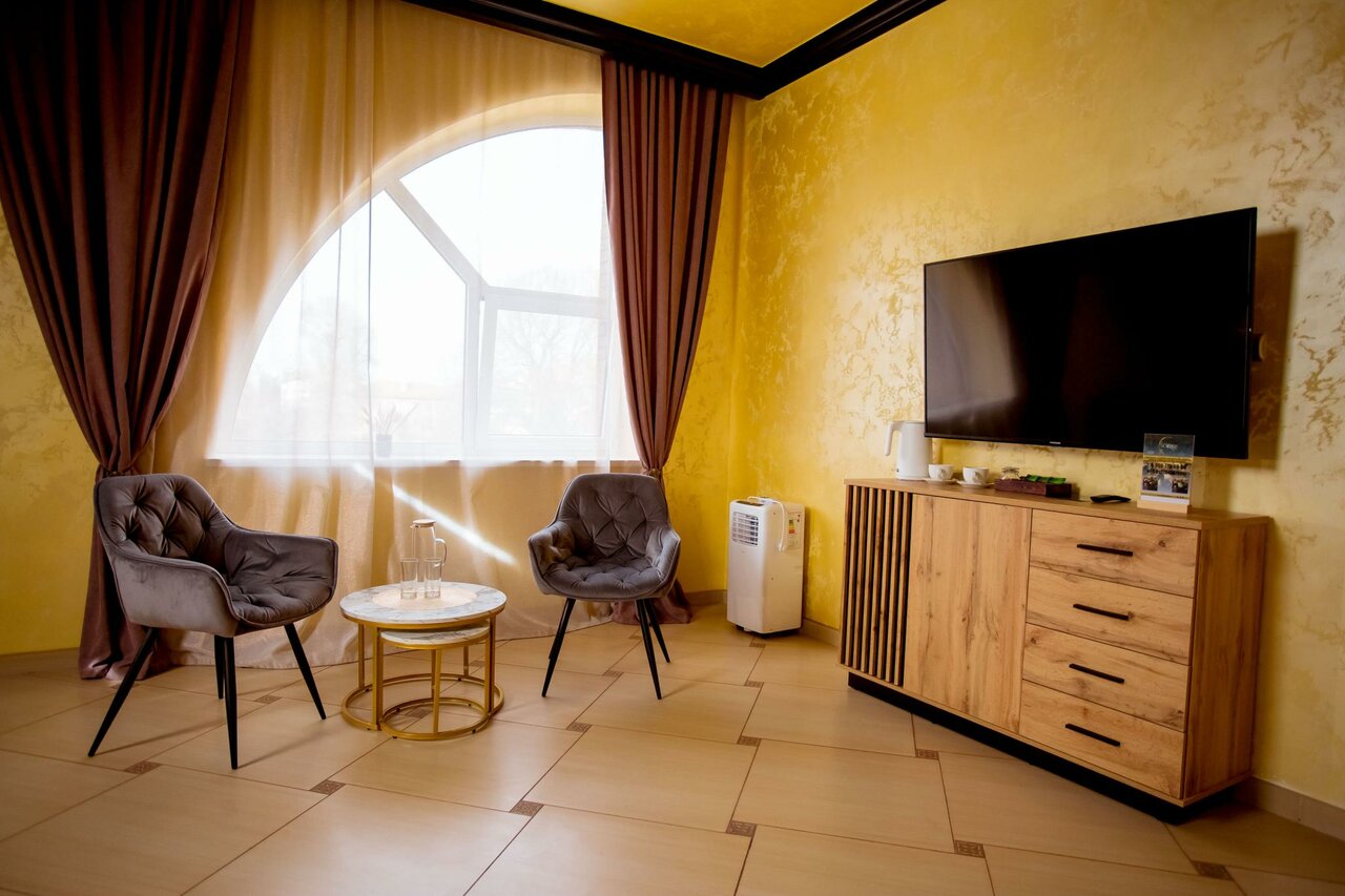В номер входит: кровать King Size, прикроватные тумбы, телевизор, холодильник, диван, столик с удобными стульями, чайник, собственный санузел, душванна, фен. Предоставляются гигиенические принадлежности, тапочки и халат. Бесплатный Wi-Fi.