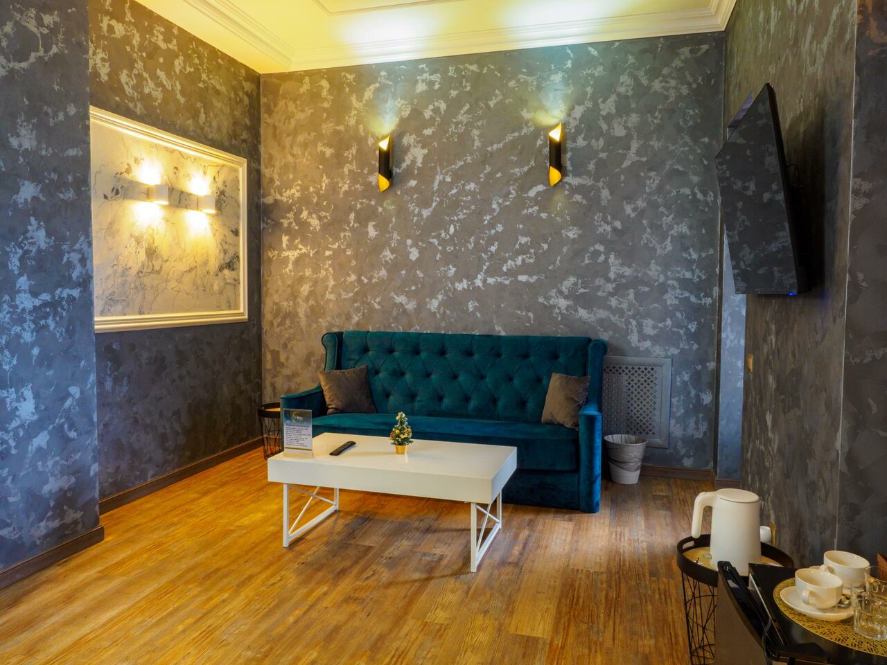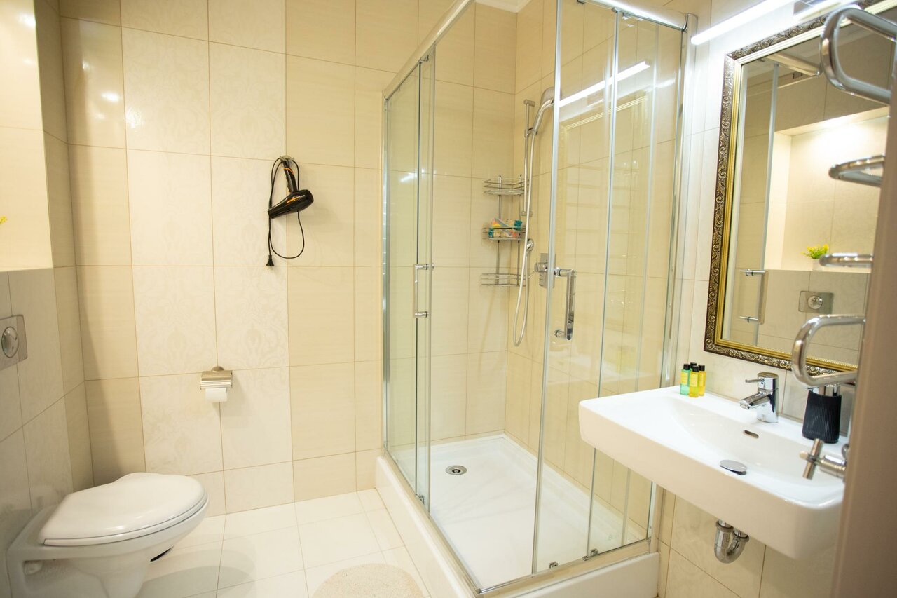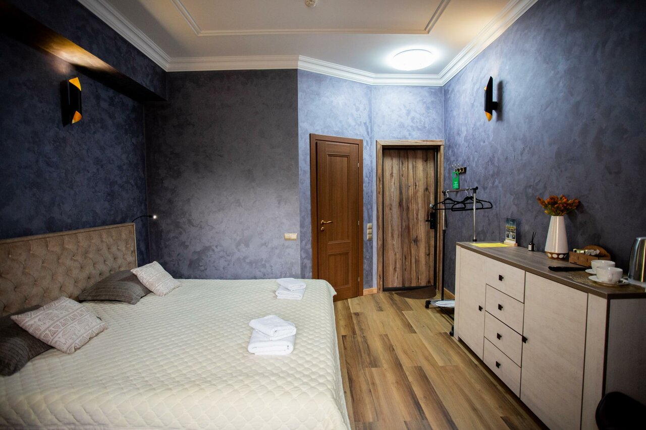 В номер входит: кровать King Size, прикроватные тумбы, телевизор, холодильник, диван, столик с удобными стульями, чайник, собственный санузел, душванна, фен. Предоставляются гигиенические принадлежности, тапочки и халат. Бесплатный Wi-Fi.