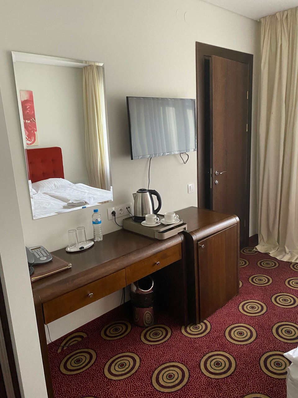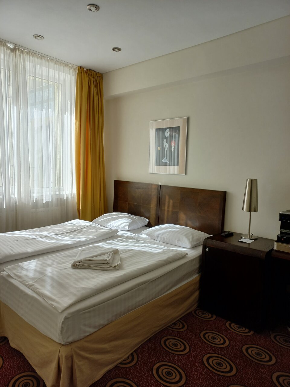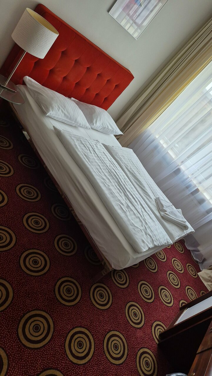 Хорошие кровати, но узкие)) чудесный конференц-холл на 3 м этаже, но без окон. Завтрак: каша всегда, сырники — всегда, фаршированные блинчики — всегда. Капучино и латте — нет. Добавляем молочко из кувшина или порционные сливки. Сантехника — на твердую 4ку, но напор не супер-пупер: массаж душем не получится. Зубной пасты и щётки в бесплатном формате нет. Отопление — очень комфортно. Персонал — очень вежливый. Особенно на кухне. Полотенчики — мягкие. Телевизор расположен удобно. Не хватает чуть-чуть размаха окон для более качественного нанесения макияжа. Но зато — можно чудесно выспаться.