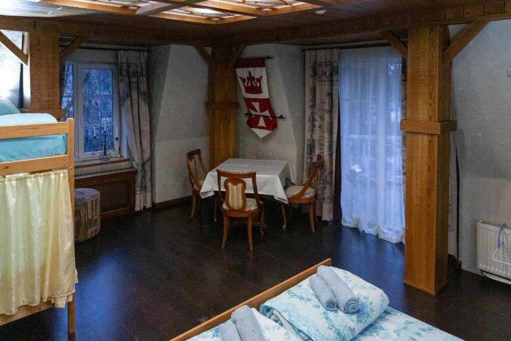 Обычный хостел. Взяли самый большой номер — с большой кроватью и двухэтажной. Кровать удобная. Батарея работала (ездили на майские). Дальше увы все(((( В ванной плесень чёрная, волосы, на дне трещины. Занавески в комнате слишком длинные, лежат на полу, так и чесаться руки подшить. При выходе на балкон и обратно наступали на них и чуть не падали(((( Задвигаются плохо, крючки оборваны. Нет, на шератоны и хилтоны мы не рассчитывали, тем более за такую цену, но хотелось бы, чтобы было поприличнее. Все же для людей сделано… наверно…. Розеток у кровати нет, телефоны заряжали на камине. Подсветки тоже нет. Пока свет выключишьу входа и в темноте ползешь к кровати — точно посчитаешь мебель )))))