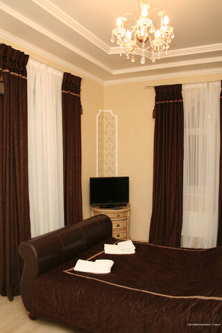 Номер категории «Студия» площадью 45 м² оформлен в пастельных тонах, создавая уютную атмосферу для отдыха. Светлый и просторный номер круглой планировки с витражными окнами, выходящими на пересечение двух главных улиц города. В номере одна двуспал...