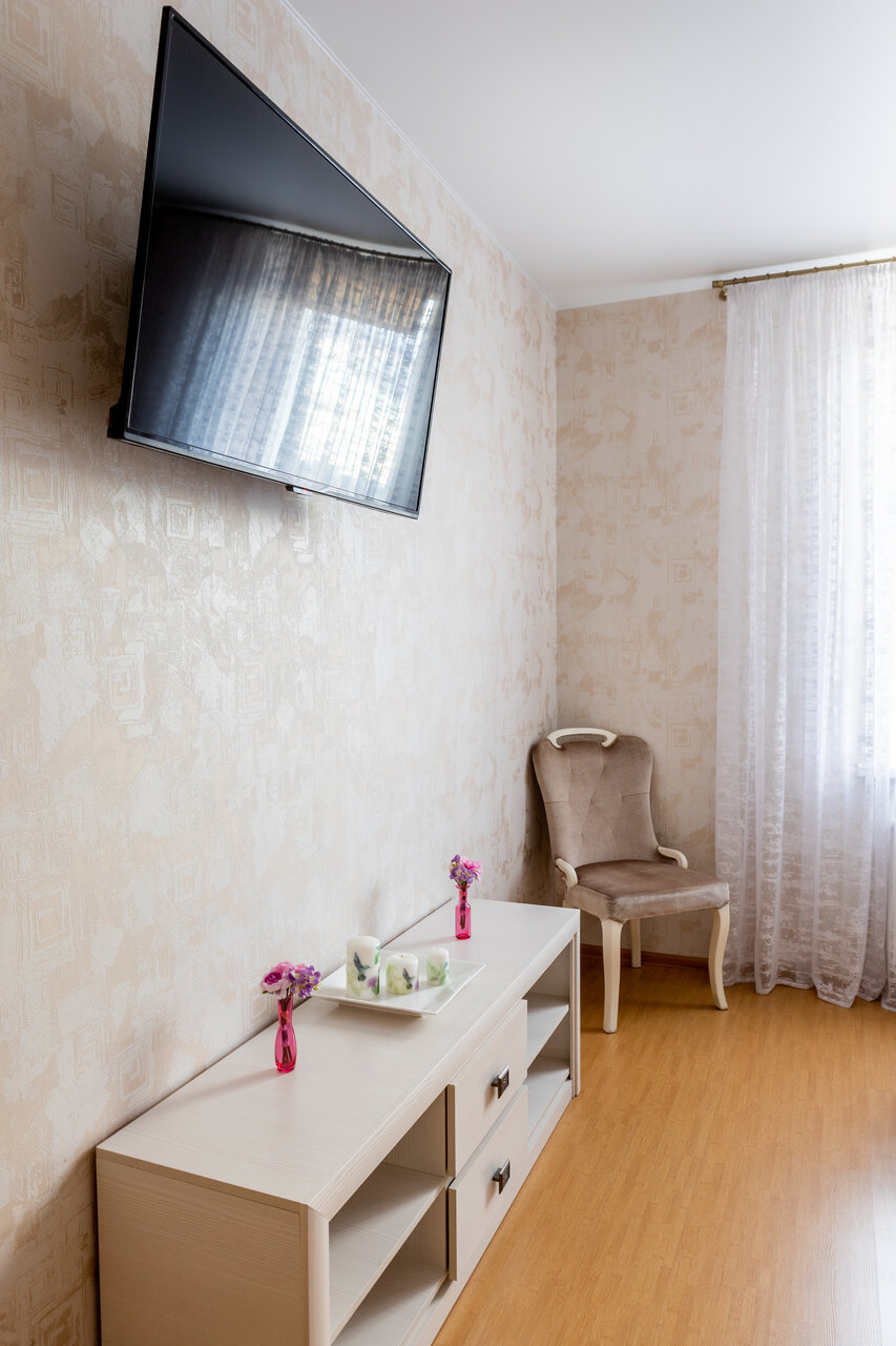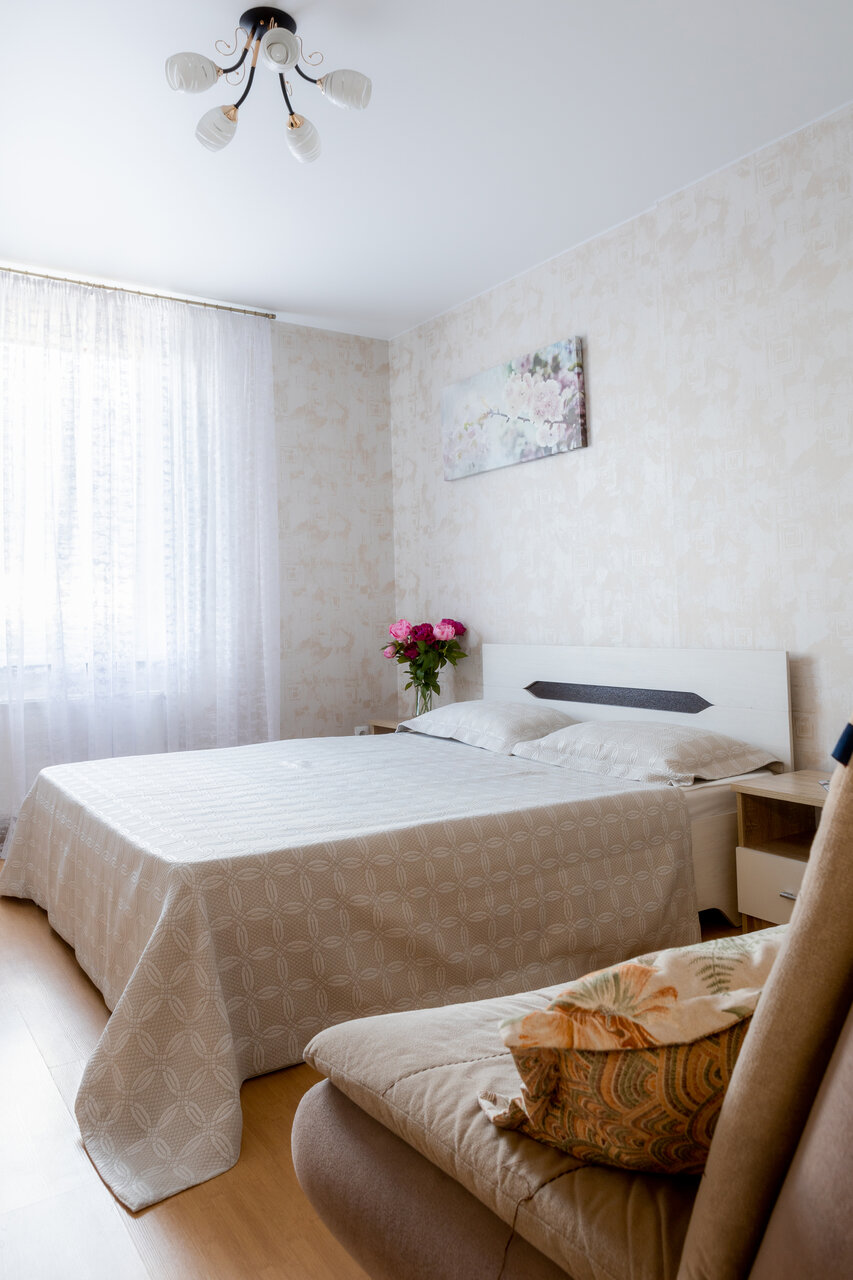 Очень хорошее расположение. Шикарная просторная квартира. 2 с/у. Девушка на ресепшене приветливая, доброжелательная. В целом проживание понравилось, буду рекомендовать. Но есть ряд недочетов. Не хватает рожка для обуви, ролика для одежды. Очень неудобная раскладушка, не спасли даже дополнительные одеяла, рейки жёсткие. Пол плохо помыт. Без предупреждения и звонка утром зашел в квартиру сотрудник-мужчина, открыв дверь своим ключом, занес пылесос. Можно было хотя бы позвонить в звонок.