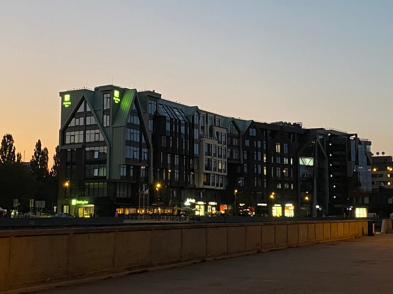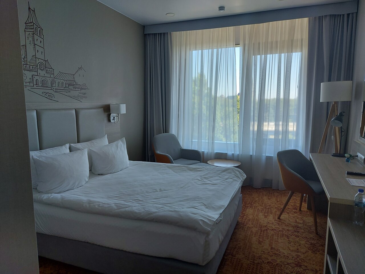 Отдыхали в Калининграде с 17 по 22 мая 2024 г. Остановились в отеле Холлидей Инн и не пожалели. Прекрасная архитектура здания, месторасположение идеальное. Брали номер с двумя раздельными кроватями с видом на реку. Отличный компактный, но не тесный. Мебель скромная но все аккуратно, свежее. матрацы на кроватях очень удобные. Уборка номера на 5+. Доброжелательный персонал. Хорошие завтраки, придраться конечно можно всегда, но голодными не останетесь, все вкусно, свежие фрукты и овощи. В ресторане при отеле также все понравилось, по ценам как во всех ресторанах в округе. В целом очень рекомендую, в том числе и семьям с детьми (есть детский уголок в лобби).
