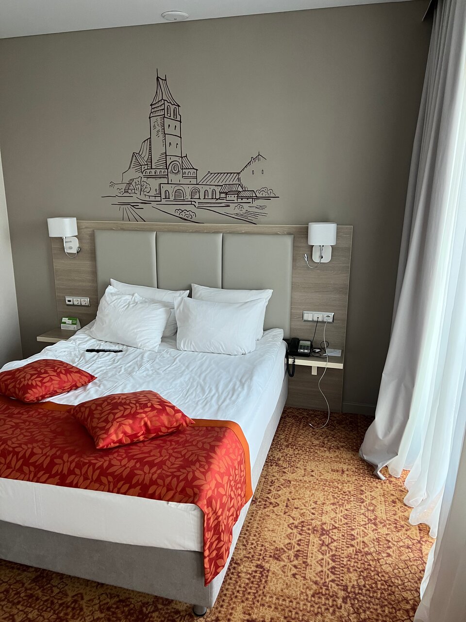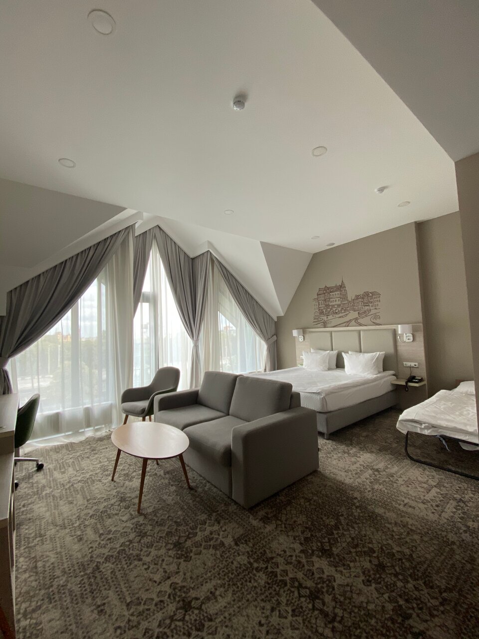 Очень хороший отель, прекрасное расположение в центре города, около реки, остров Канта напротив в шаговой доступности. Номера очень уютные, есть чайник, кофемашина. Больше всего удивило и очень порадовало наличие теплого пола в ванной, включается автоматически утром и вечером — невероятное удовольствие выйти из душа и встать на теплый пол. Также в ванной и в номере огромное количество крючков, это так удобно, не понимаю, почему в большинстве отелей на них экономят. Уборка шикарная. Завтрак разнообразный и вкусный. К детям особый подход, как и всегда в Калининграде, сын получил магнит, который можно было обменять, кажется, на мороженое, а также нам выдали купон на бесплатное детское блюдо в ресторане.