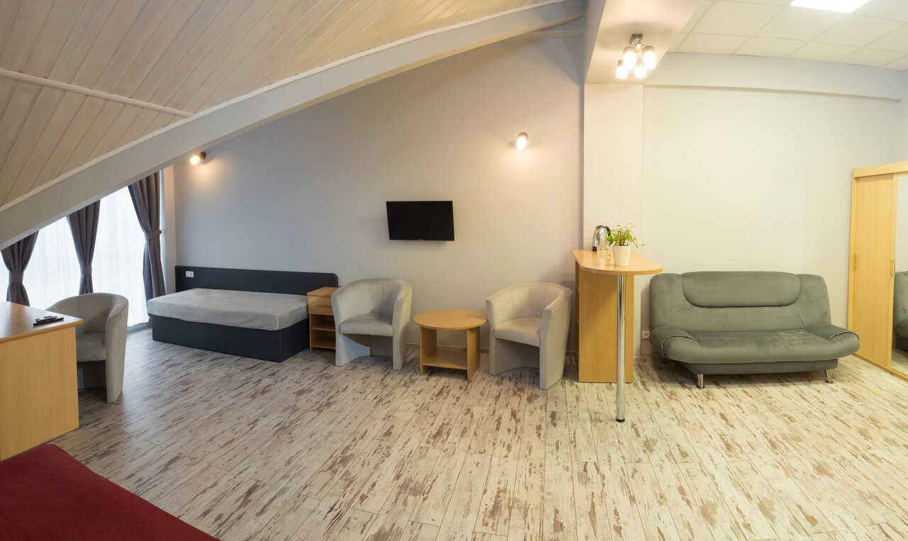 Уютный однокомнатный номер категории «стандарт» оборудован всем необходимым для полноценного отдыха. Идеальный вариант для гостей, сочетающих работу и отдых.В стоимость проживания входит посещение банного клуба 'Лёд' с 10:00 до 15:00.Соблюдаются