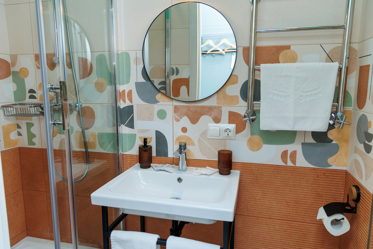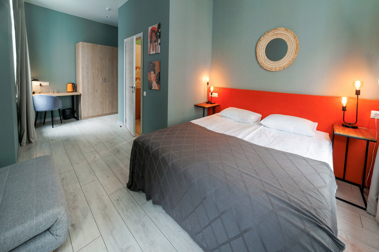 Хороший номер, в котором есть всё необходимое. Банные принадлежности, полотенца. Удобная кровать и диван. В номере есть чайник и холодильник. Очень приветливый персонал, все вопросы помогли решить. Из небольшого минуса можно отметить слабую шумоизоляцию, но нас это не сильно беспокоило, так как соседи все были хорошие и не шумные 🙂