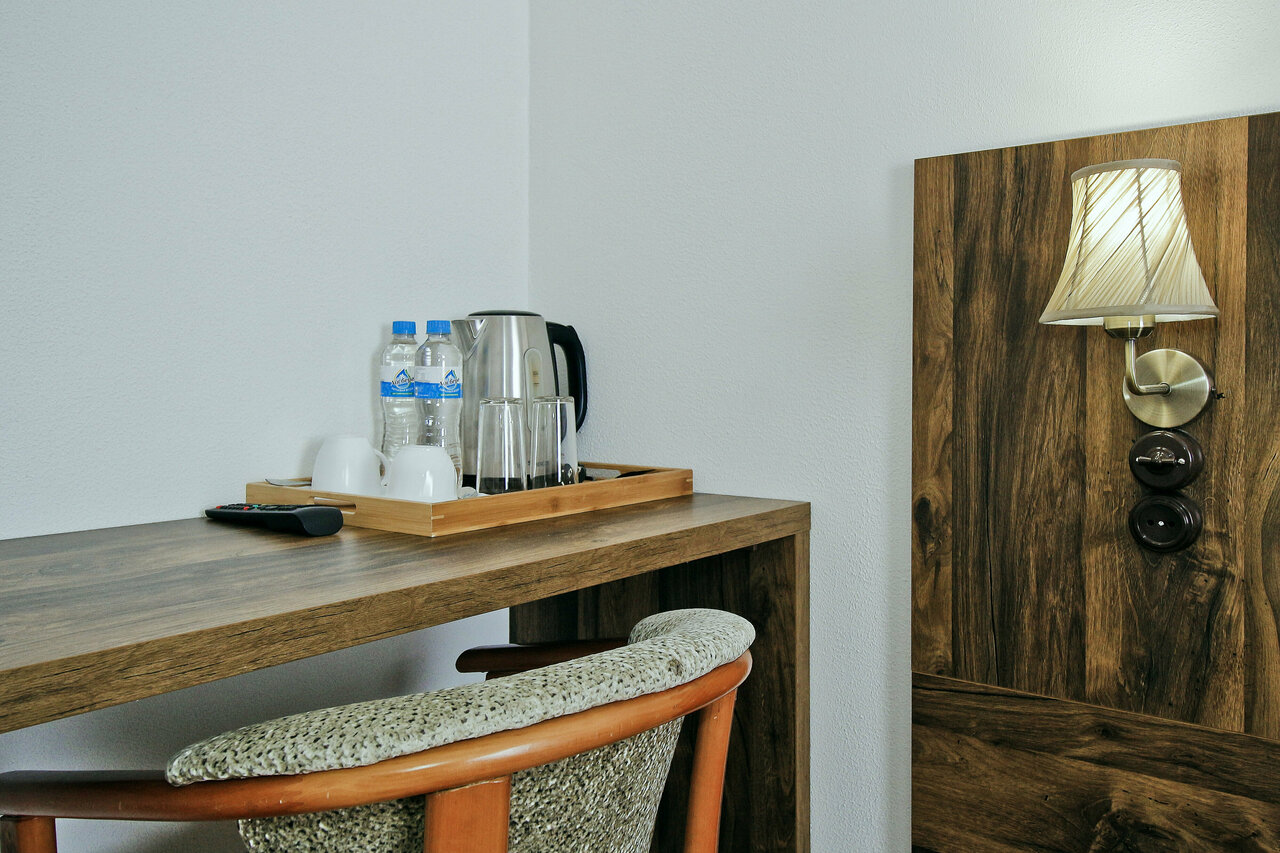 Розетки нужно сделать повыше, нет столовых приборов, тарелок, кувшина для воды. Необходимо улучшить освещение в номере, желательно поставить микроволновую печь, питание в отеле дорогое. Омлет из двух яиц стоит 200 руб. Сантехника устаревшая, раковина с трещиной, фен по запросу так и не увидела. Неудобная планировка номера студии, нет штор.