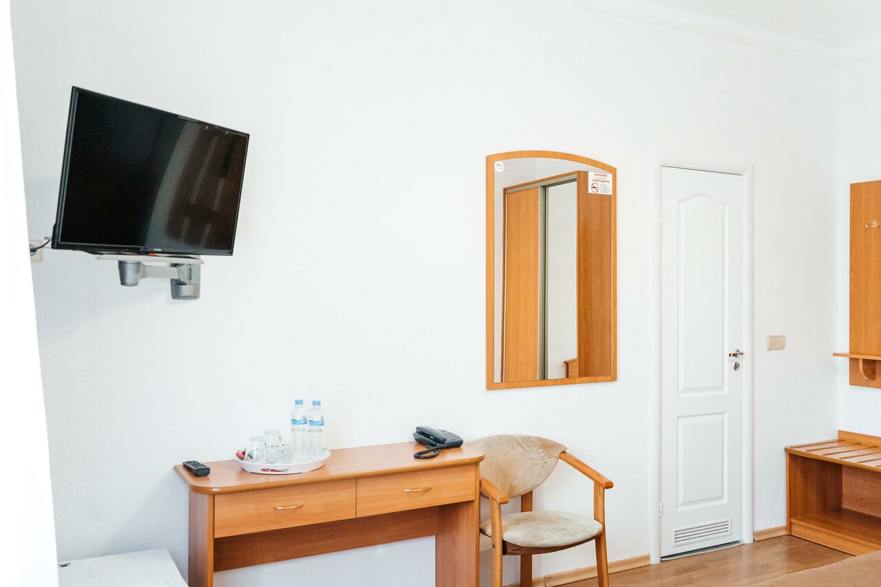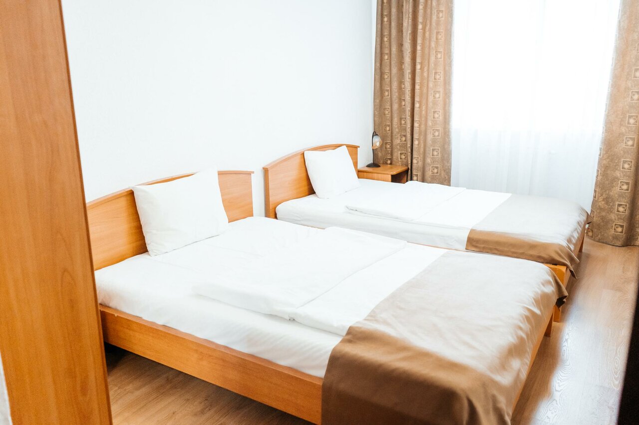 Площадь номера позволяет комфортно расположиться двум гостям.Номер оформлен в общей стилистике мини-гостиницы и оборудован двумя односпальными кроватями с прикроватными тумбами, большим зеркалом и туалетным столиком.В номере вы можете воспольз...