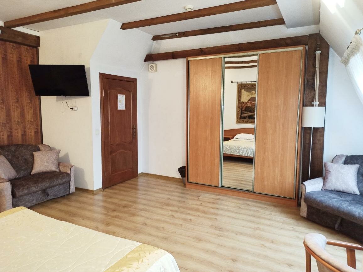 Большая комната оборудована всем необходимым для комфортного проживания трех человек.Двуспальная кровать с прикроватными тумбами, полутороспальная кровать, мягкий диван, два кресла, шкаф-купе, зеркало и журнальный столик.Отдельная ванная комна...