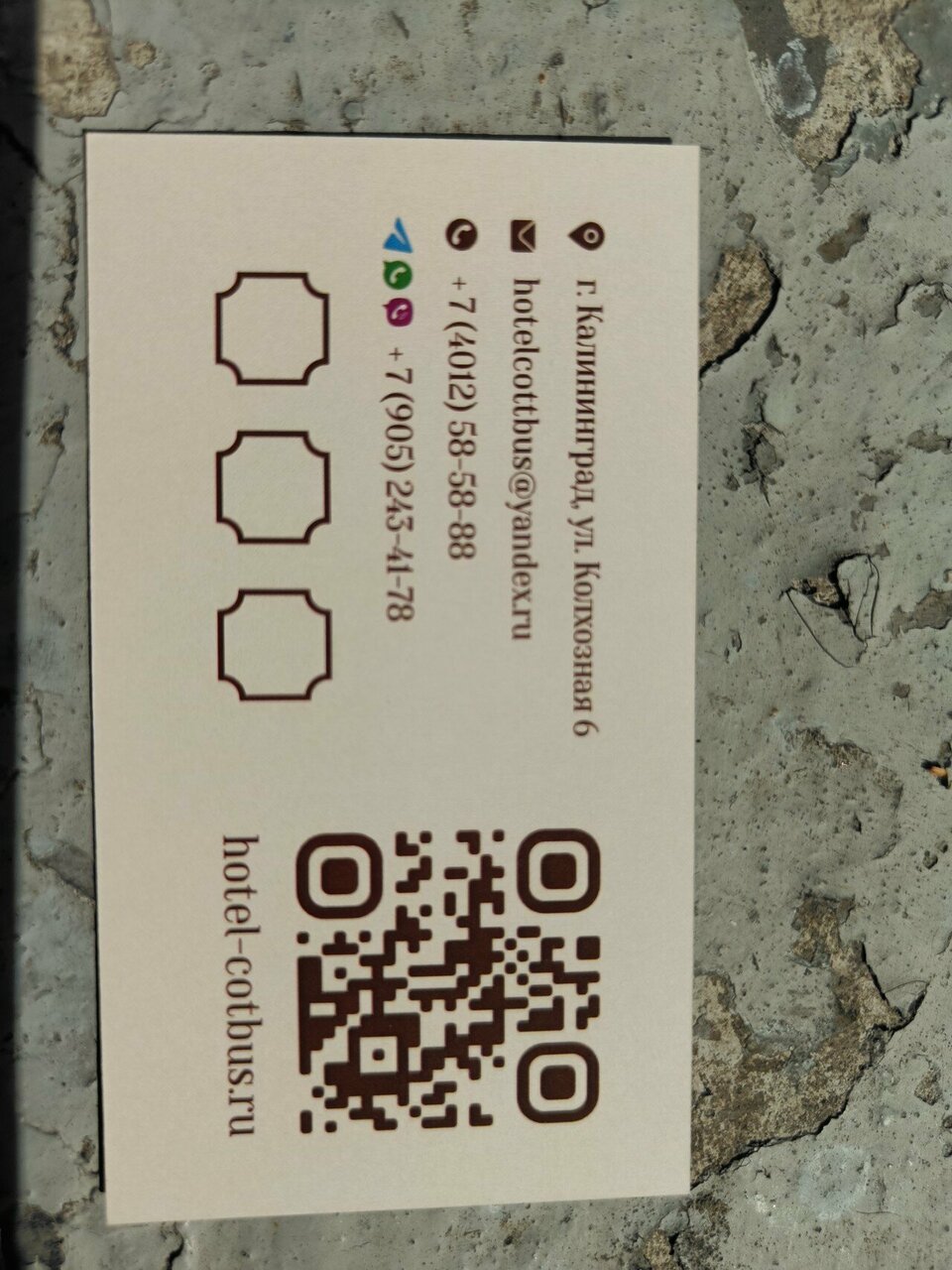 Контакты: +7 (905) 243-41-78, +7 (4012) 58-58-88. Сайт: hotel-cotbus.ru. Заезд/выезд: 14:00 / 12:00. Здание построено в 2006 году, реконструировано в 2024.