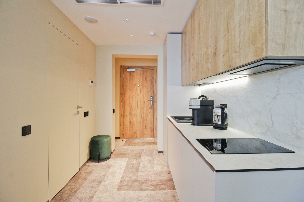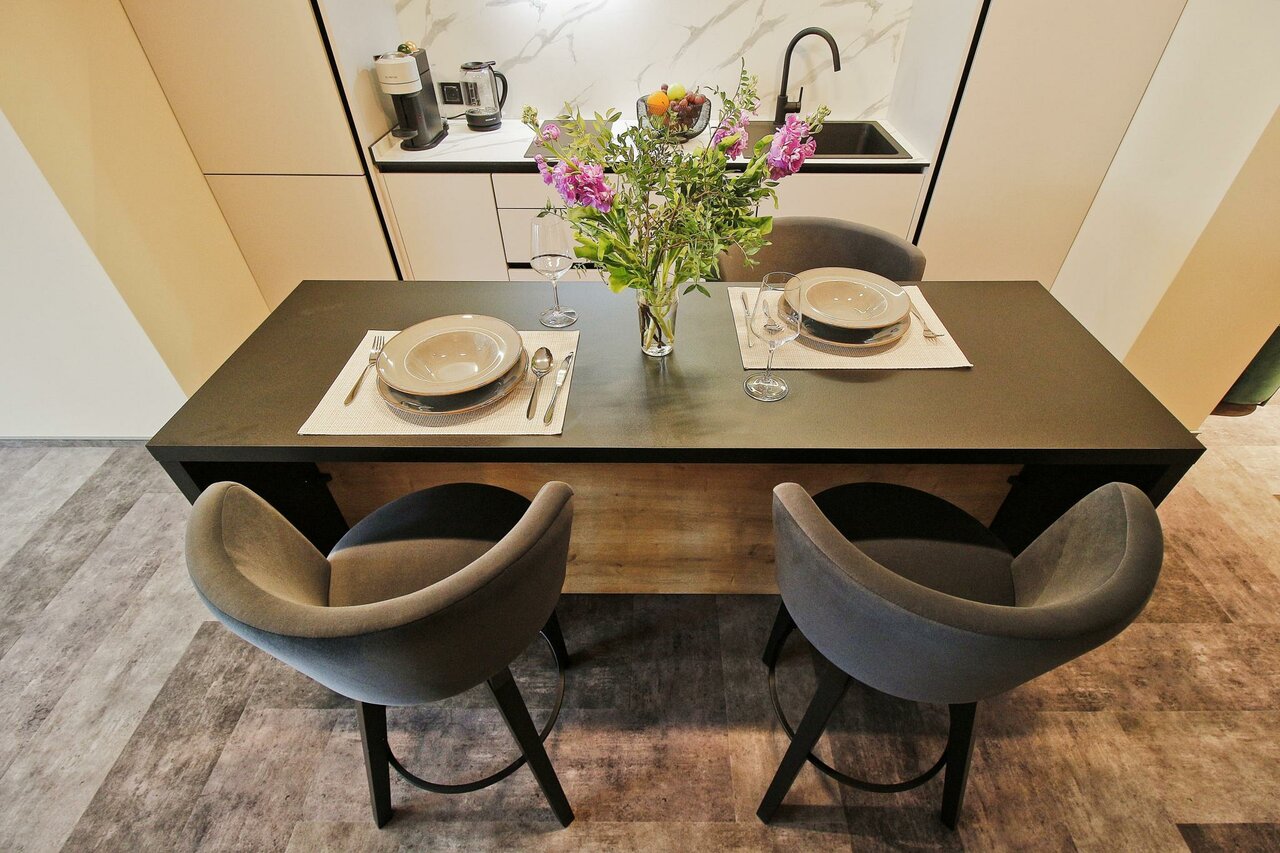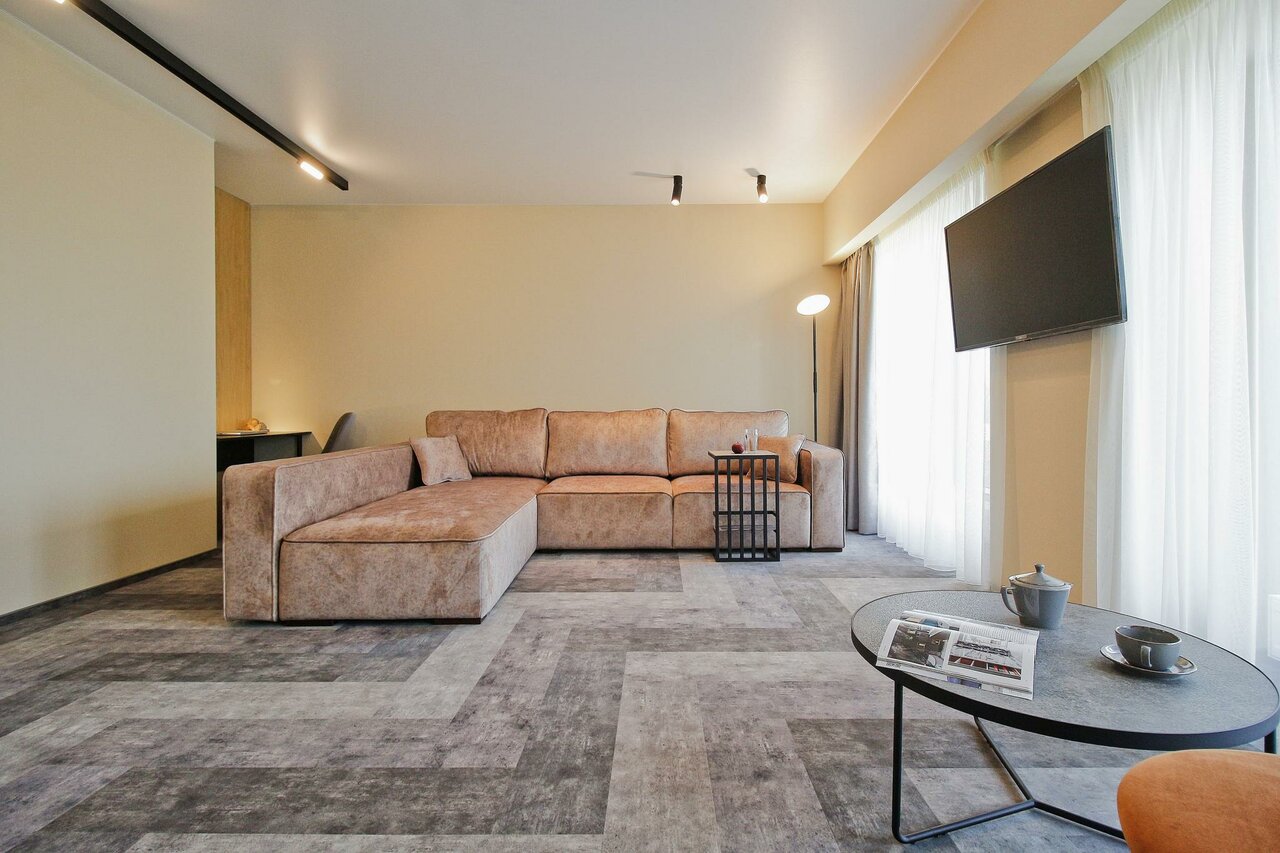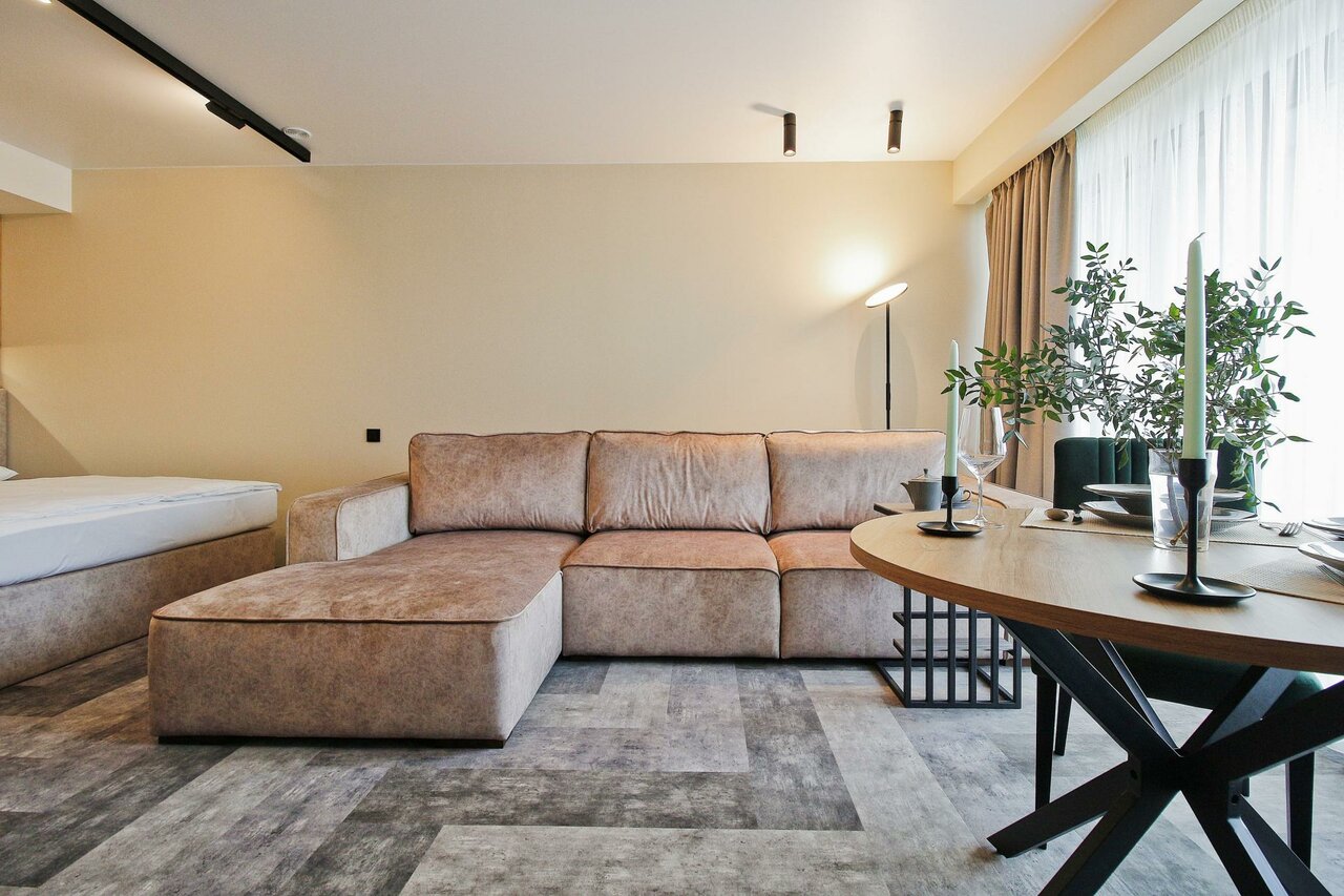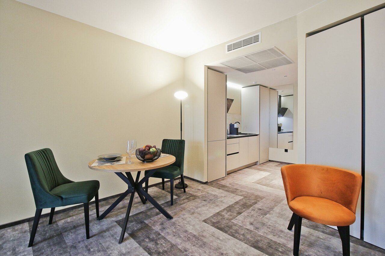 Очень приятные апартаменты. Есть все необходимое для комфортного проживания. Хорошая мебель , удобная кровать и замечательный диван). Добавляет уюта милые элементы дизайна, вазочки, статуэтки. Понравилась красивая посуда и отличный кофе. Только воду для питья и приготовления пищи надо брать из кулера(в холле) или покупать.
