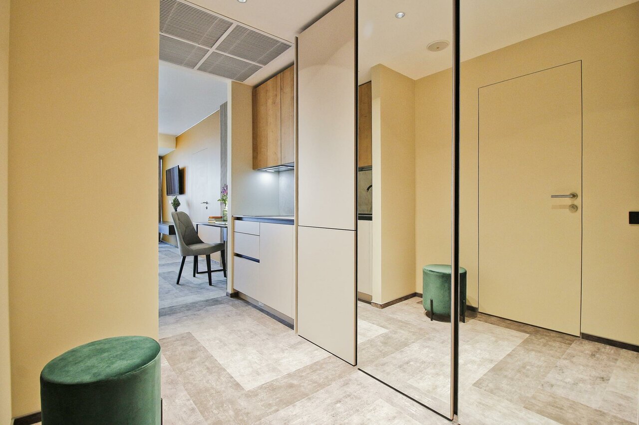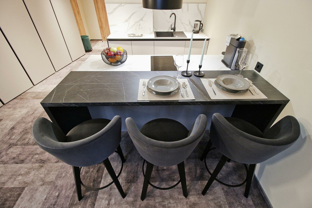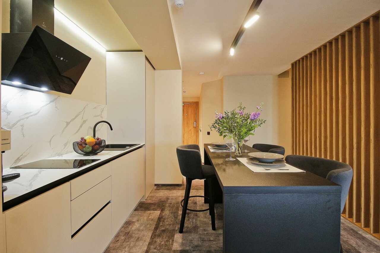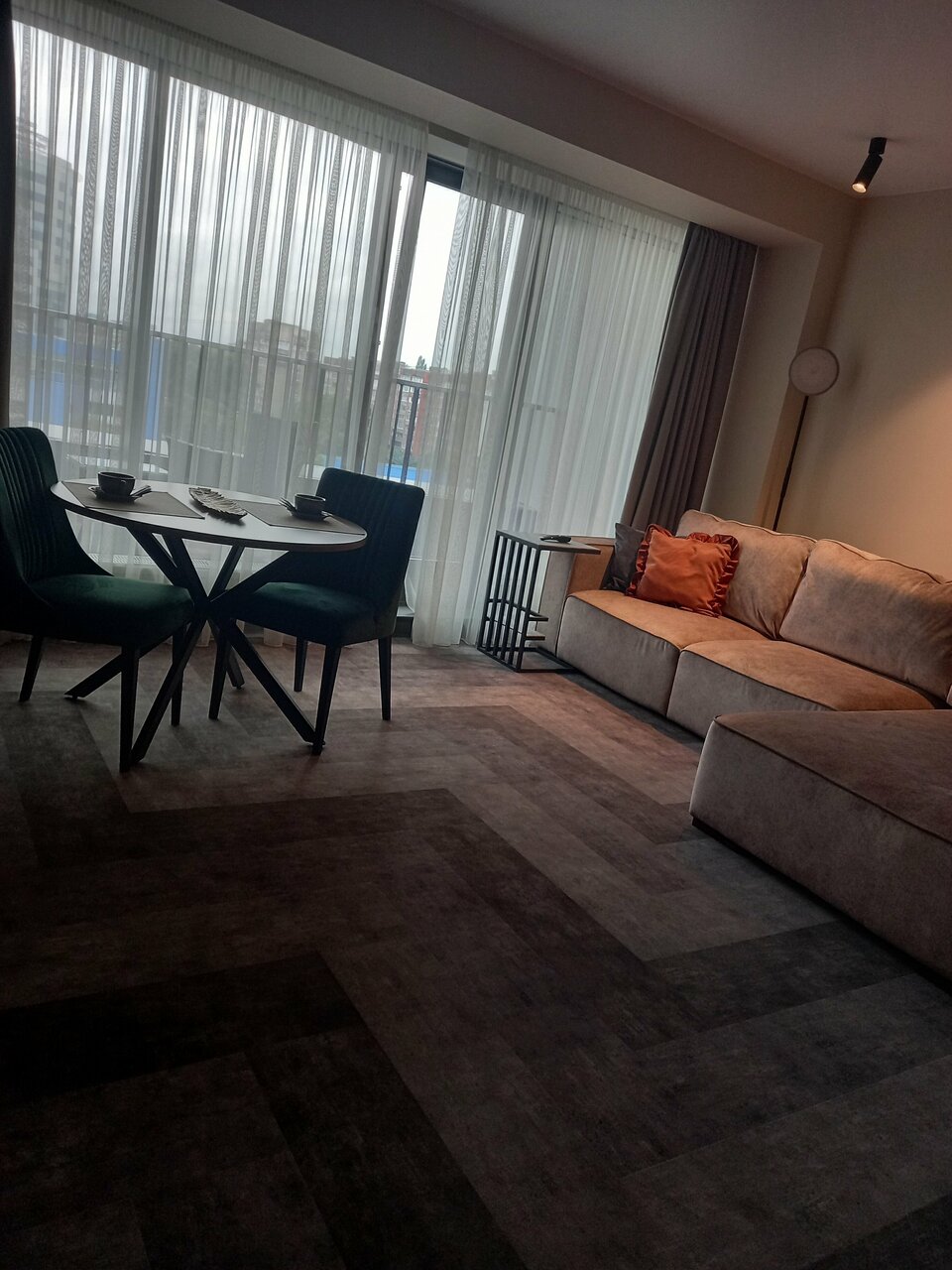 Очень приятные апартаменты. Есть все необходимое для комфортного проживания. Хорошая мебель , удобная кровать и замечательный диван). Добавляет уюта милые элементы дизайна, вазочки, статуэтки. Понравилась красивая посуда и отличный кофе. Только воду для питья и приготовления пищи надо брать из кулера(в холле) или покупать.
