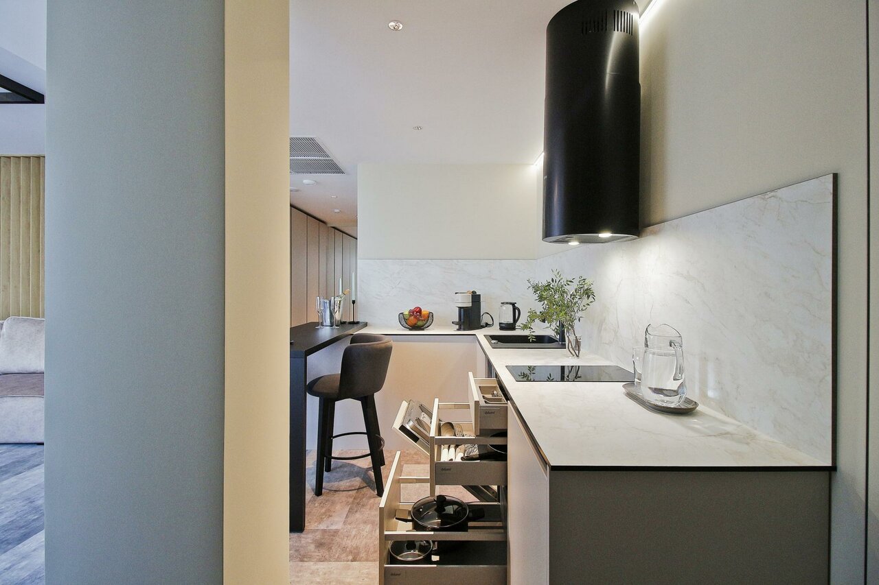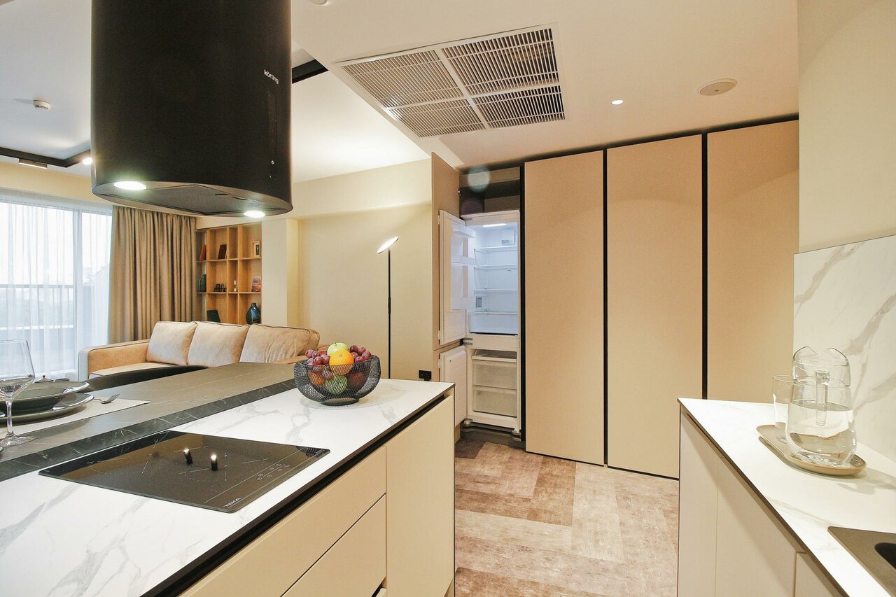 - Полноценная кухонная зона с плитой, посудой и посудомойкой.