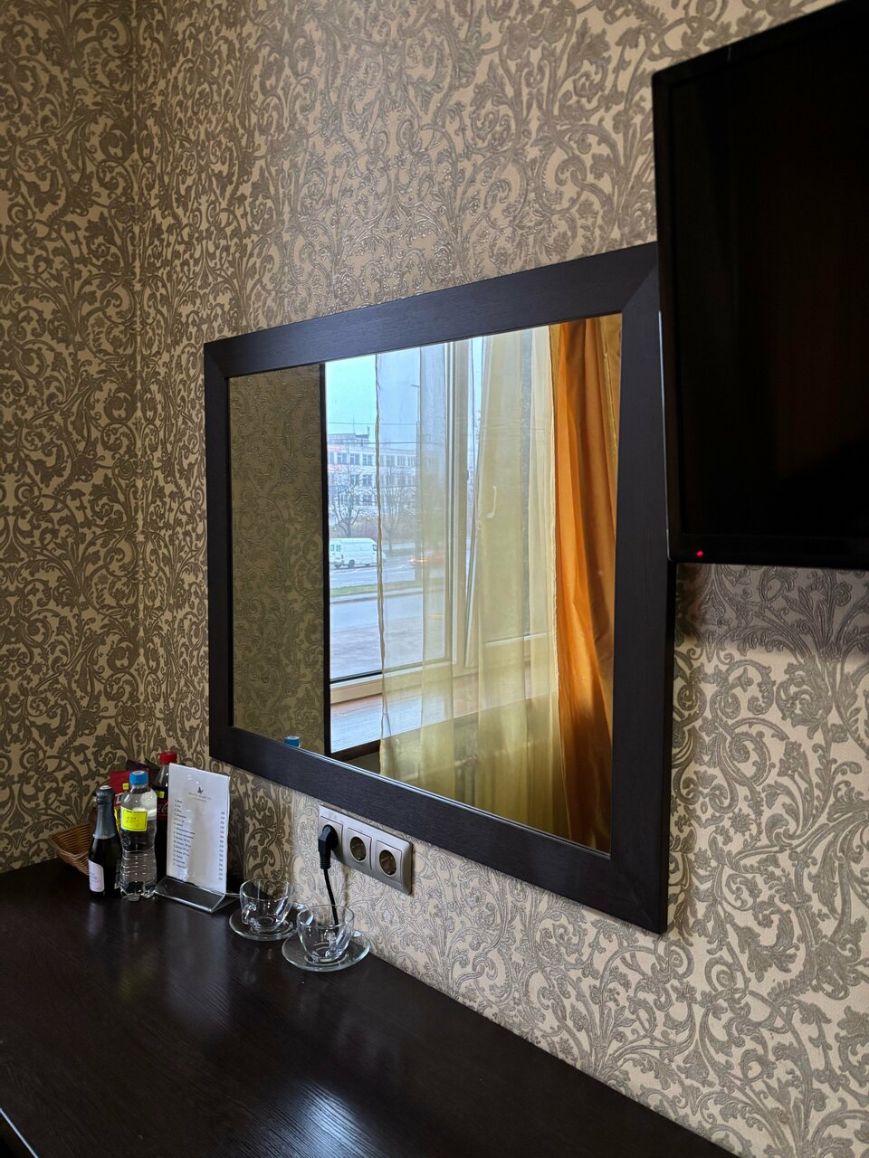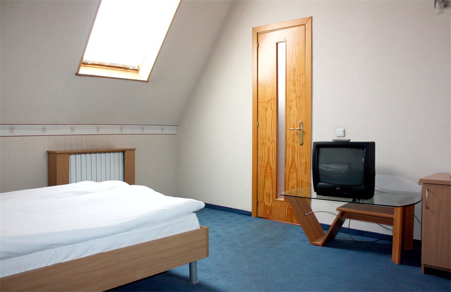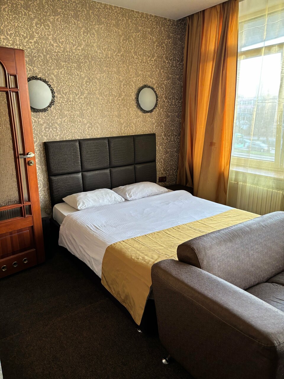 Очень маленький, грязный номер. Ни одного шкафчика- три крючка на стене. Кровать написано двухспальная, но она 140 см максимум. Убитый, весь в пятнах матрас , никакого наматрасника. Вместо прикроватной тумбочки — холодильник! Как можно спать, когда над ухом трещит холодильник?! Размеры комнаты 7 такие, что невозможно положить чемодан ( ручная кладь) приходилось перепрыгивать через него. Под кроватью — вековая пыль! Это ужасно что там только не валяется и крышки и носки, уронила карточку наклонилась и в ужасе была! Такой грязи я еще не встречала. Шторы просто жуткие не по размеру, в пятнах Нет фена, на рецепшен сказали все разобрали, нет чайника. Тоже разобрали гости. Никаких кулеров. Кол это слишком много для этого отеля.