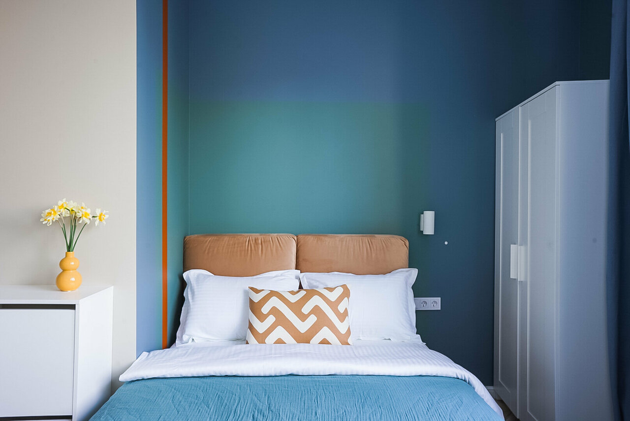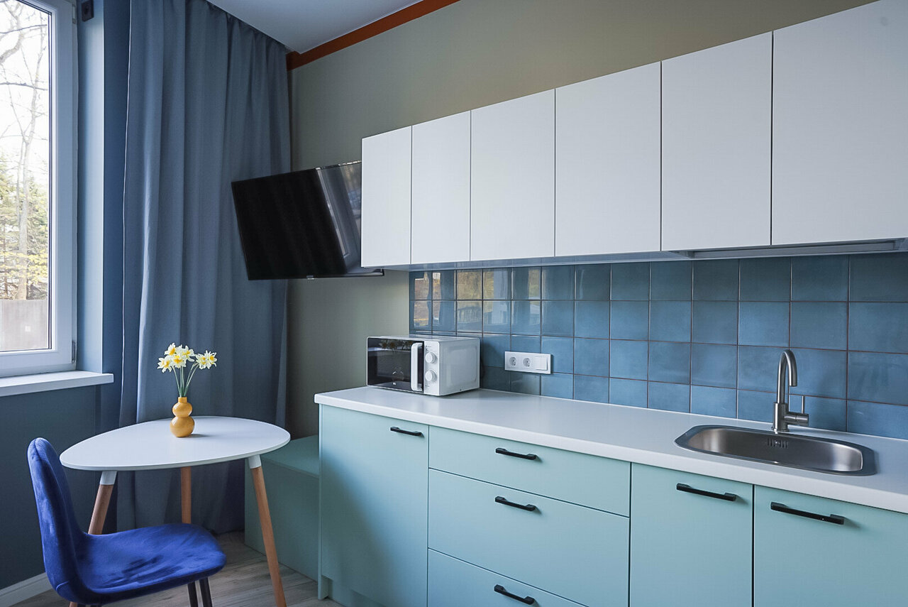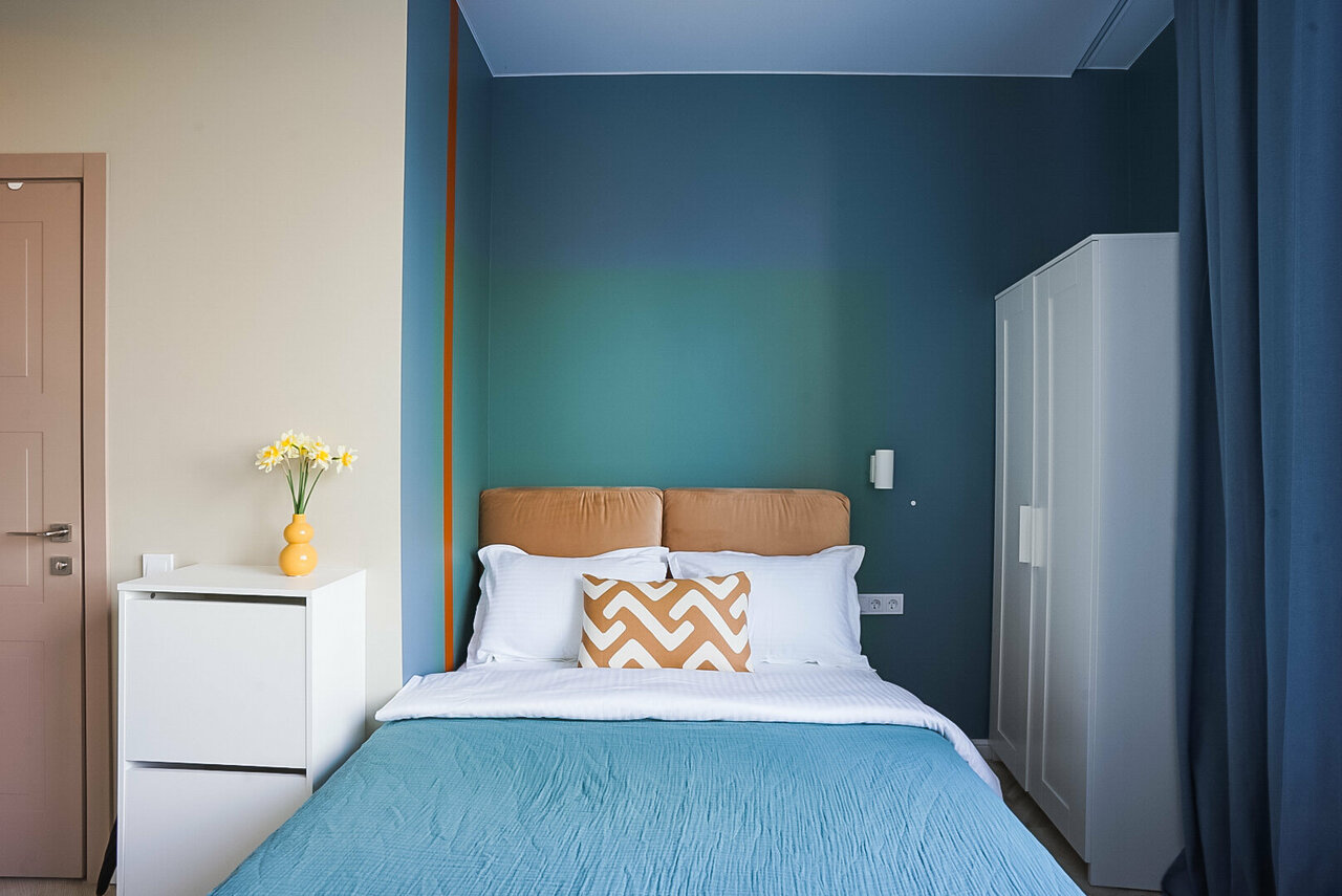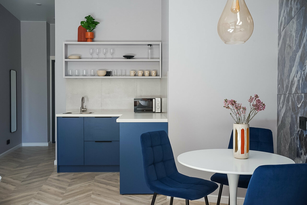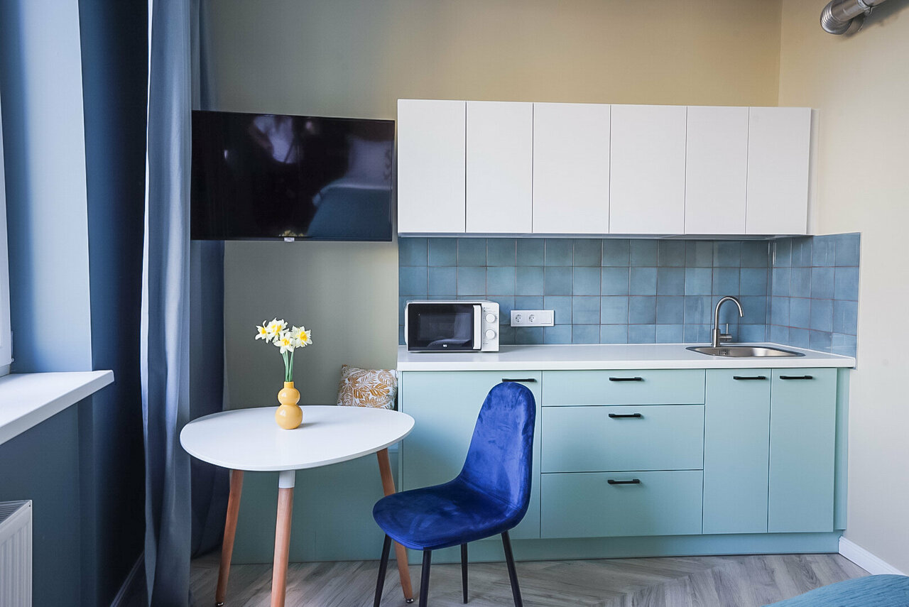 Уютная студия в синих тонах с тёплой лоджией, размещение до 3-х гостей.