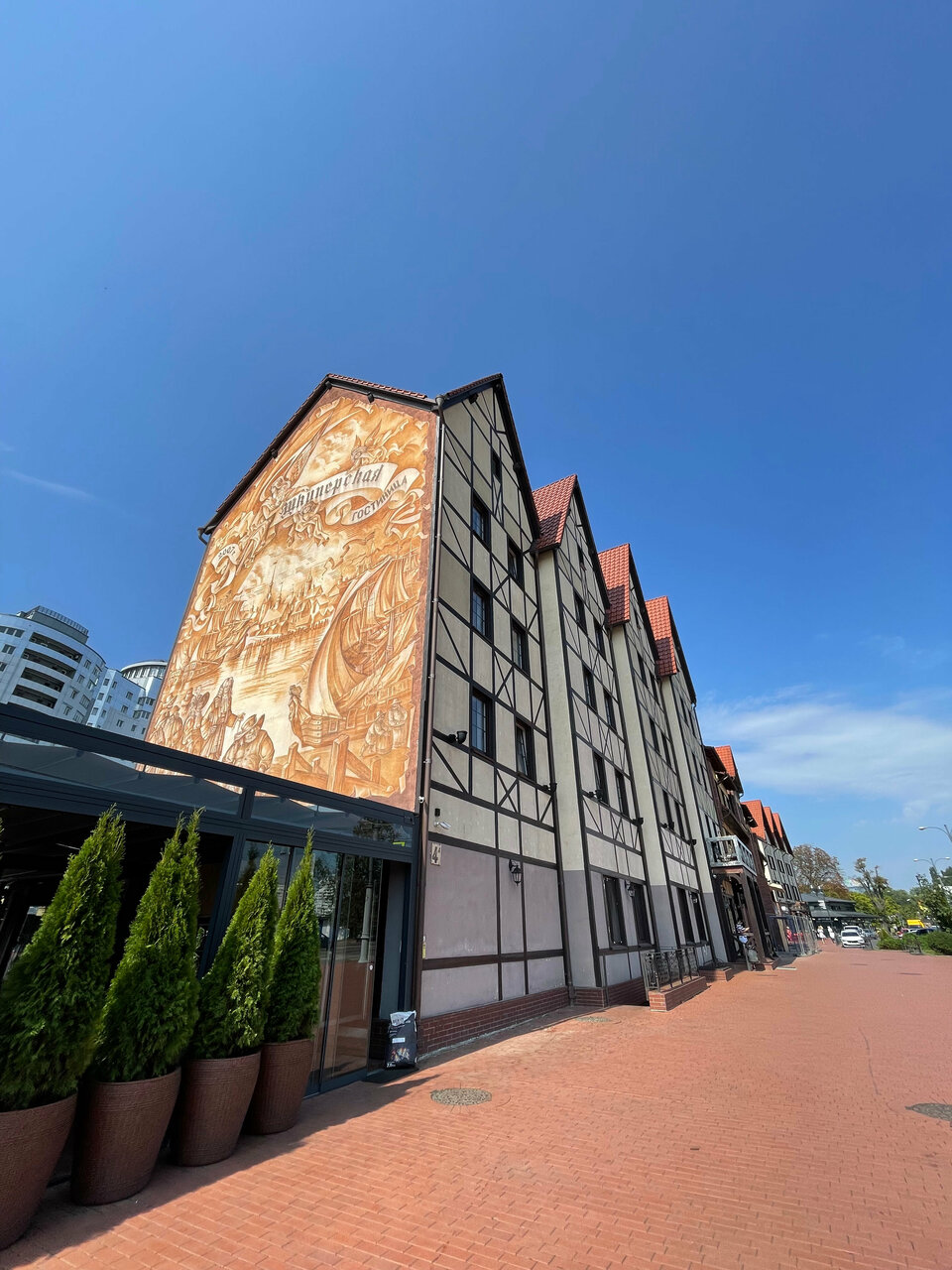 Гостиница расположена в т н Рыбацкой деревне, на берегу реки Преголя, исторический и культурный центр города, перед Медовым мостом и островом Канта,