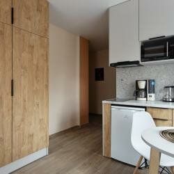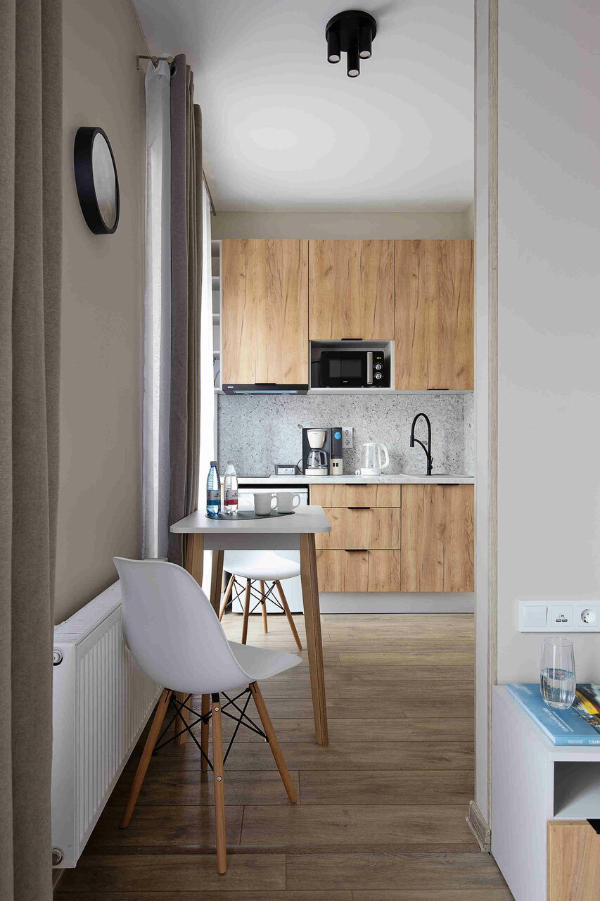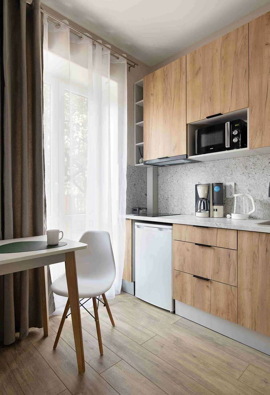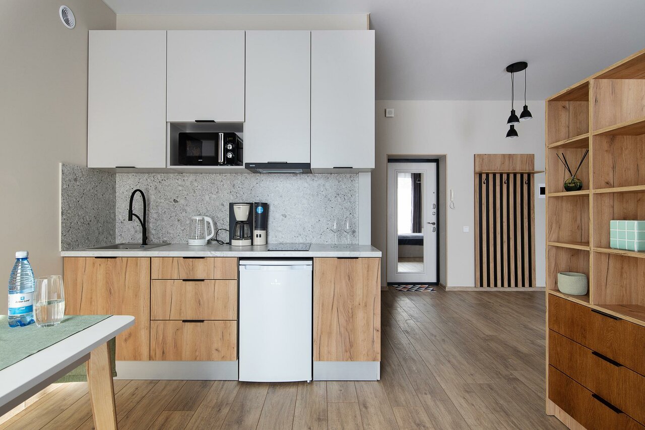 - Удобная и компактная кухня с необходимой техникой (плита, микроволновка, чайник).