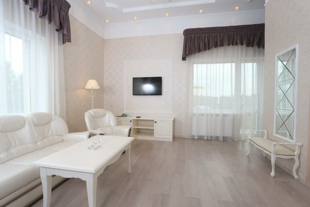 Двухкомнатная студия для 2 человек. В номере двуспальная кровать, 2 телевизора, собственный санузел и гардеробная, оборудованная мини-кухня с СВЧ, чайником, плиткой для готовки, холодильником, посудой. Бесплатный WIFI