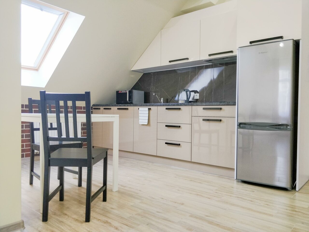 Превосходный отель! Удобное расположение. Комфортные номера в виде аппартаментов с собственной кухней, ванной комнатой, прихожей, где есть все необходимое. Чувствуешь себя как будто дома. Номера чистые, уютные, мебель и отделка все новое, белье чистое белоснежное. На каждом этаже стоят куллеры с водой! В аппартаментах на 2-3 этажах есть по два балкончика: из кухни и спального помещения.