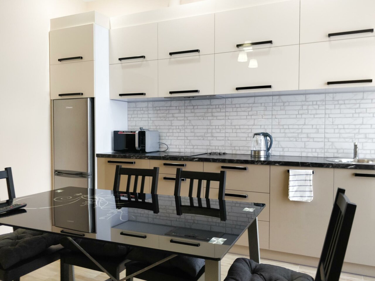 - Полностью оснащённая кухня (плита, микроволновка, посуда, холодильник).